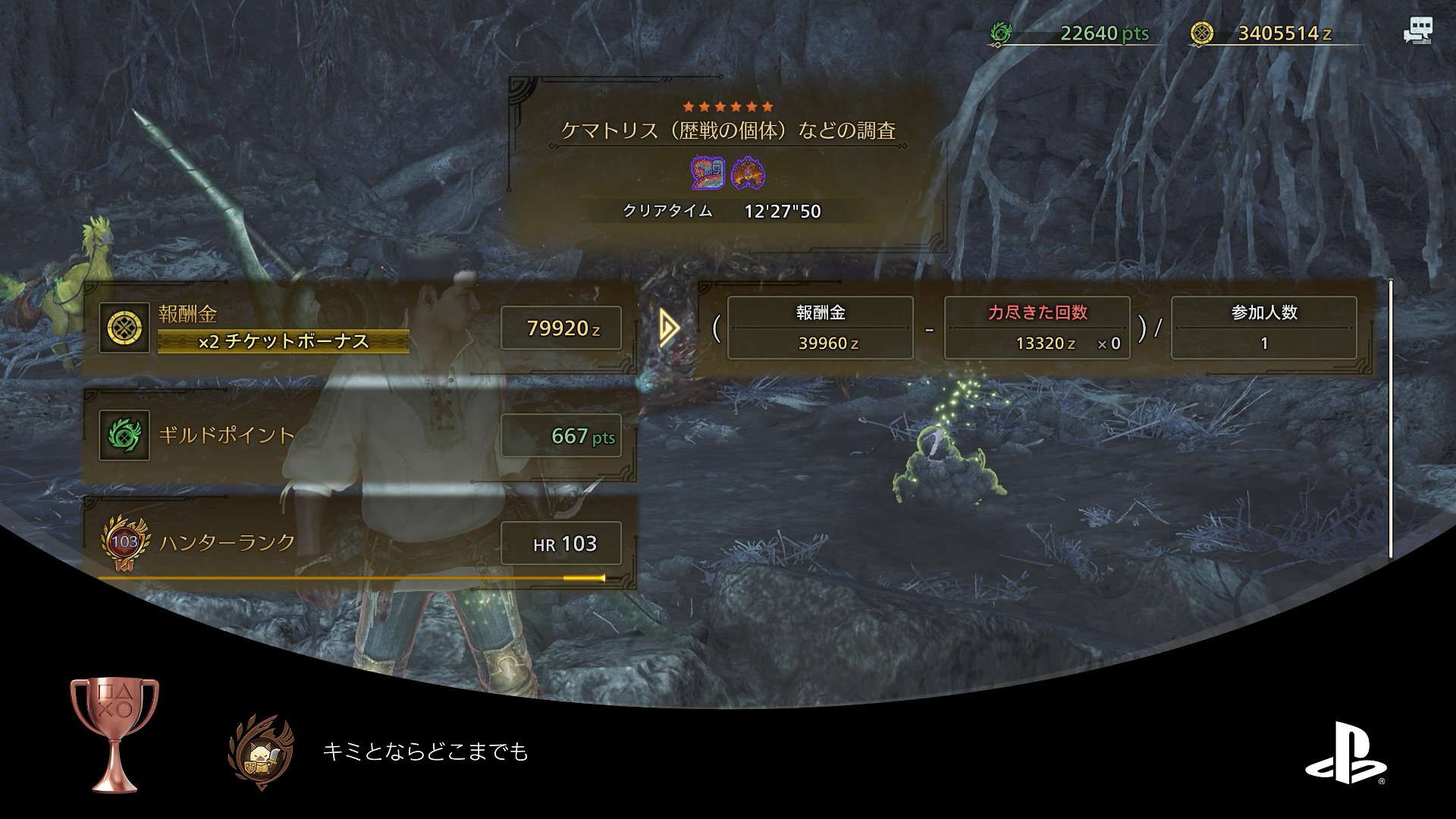 …いっぽう、残ったオンライン限定トロフィーである「●仲間と共に、いつまでも」は、クエスト100回のクリアーを要求されるので、すぐに入手することはできない。ただまあ、オンラインだと、5分も掛からずにクエストが終了するようなこともあり、今回はPS5なので、ロード時間等のテンポも、過去作とは比べ物にならないくらいに良い。100回というと、なかなかキツそうだが、恐らく、この1ヶ月で達成可能であろう。