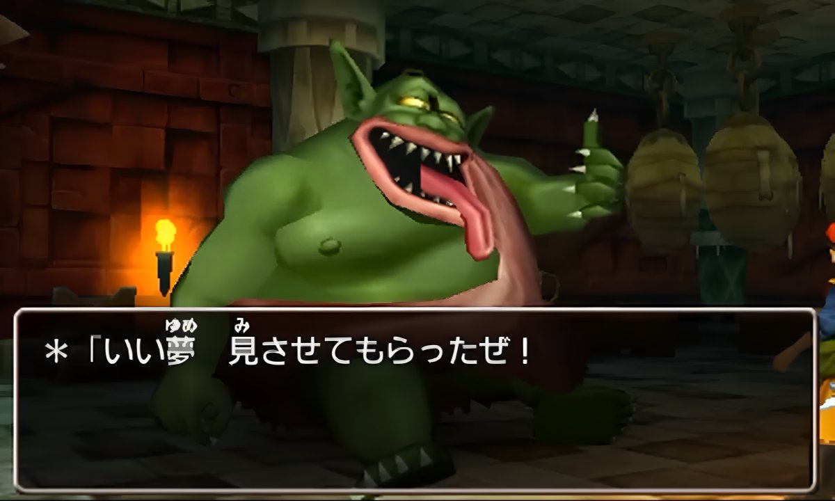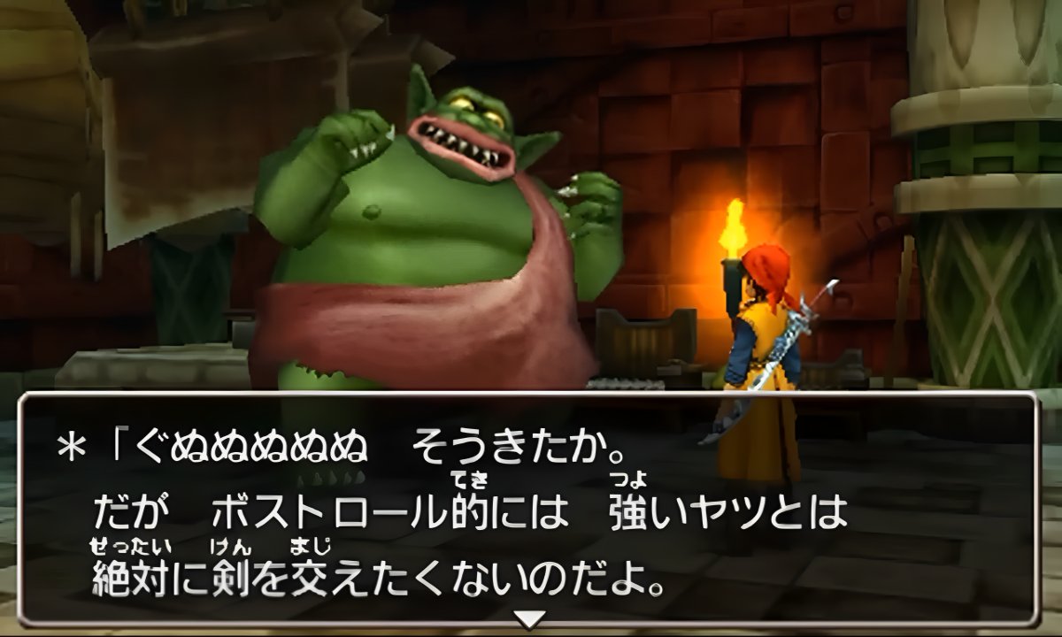 ――ちなみに、ここでの悩みとして、お金が足りず、装備が全く買えない。3DS版ということで、雑魚戦の回避は容易である。また、ドルマゲスを倒すと、それより強いボス(ストーリー攻略上の体感という意味ではなく、純粋にパラメーターで上回る敵)は、とうぶん登場しない。さらに、3DS版でメタル狩りが容易になってしまった都合、経験値に困ることは無くなったのだが、メタル系モンスターはお金についてはほとんど落とさず、お金版のメタルスライムと言えるモンスターも存在しない(「ゴールドマン」という敵も出るが、せいぜい数百ゴールドである)。経験値に関するストレスが無くなった今、余計に資金不足のほうを強く感じてしまうというものである。あれか、ドラクエシリーズは、毎作必ず現実的で嫌な気分になるシーンを入れてくるが、資金不足がそれなのか。