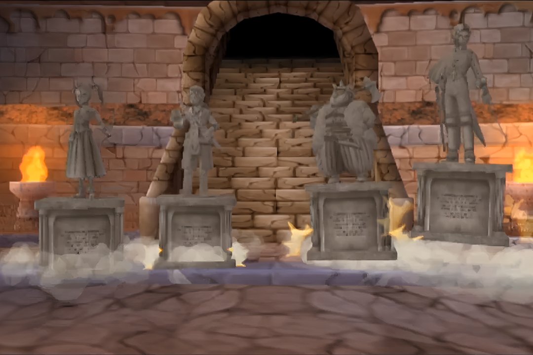 ――さて、この場面は、作中人物の立場からすれば、“自分自身と戦わされる”といった、恐ろしい場面であろう。だが、プレイヤー目線だと、バトル難易度は全く高くないため、所詮は連戦のひとつに過ぎない。さらに、雰囲気としても、石像の台座ごと、クルクル回ったりピョンピョン跳ねたりするので、そこはかとないギャグっぽさが漂っている。それぞれの像は、元としたキャラクターの技を使うなど、中身もこだわったおり、共通する無駄行動のテキストが全て固有、打撃モーションも全て異なるなどと、無駄に凝った作りになっている。暗黒神、君、テーマパーク経営の才能あるよ。