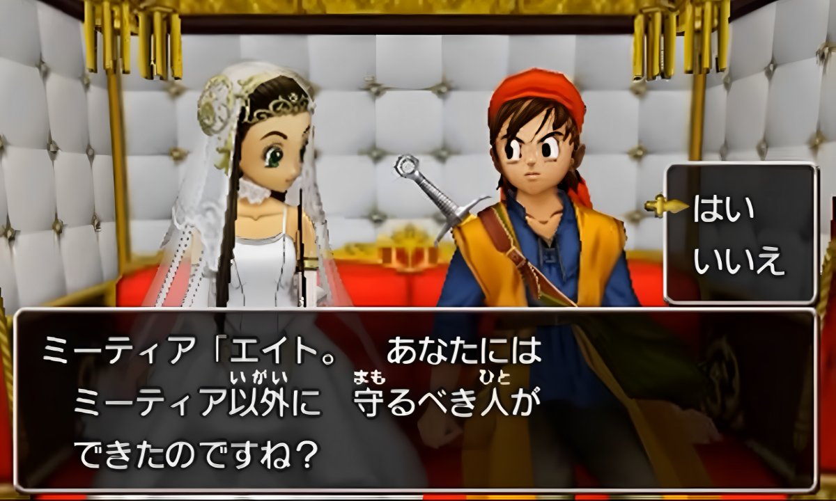 / いいえ」の選択ができる。そこで「はい」を選んだ後、続いて、「あなたには、ミーティア以外に守るべき人ができたのですね?」という問いかけが来るので、更に「はい」と答えることで、ゼシカルートへと分岐する。やれ、“守るべき人”と言っただけであり、ヤンガスルートやククールルートの可能性もあったのだが、あまりその辺りが議論されることは無いようだ。
