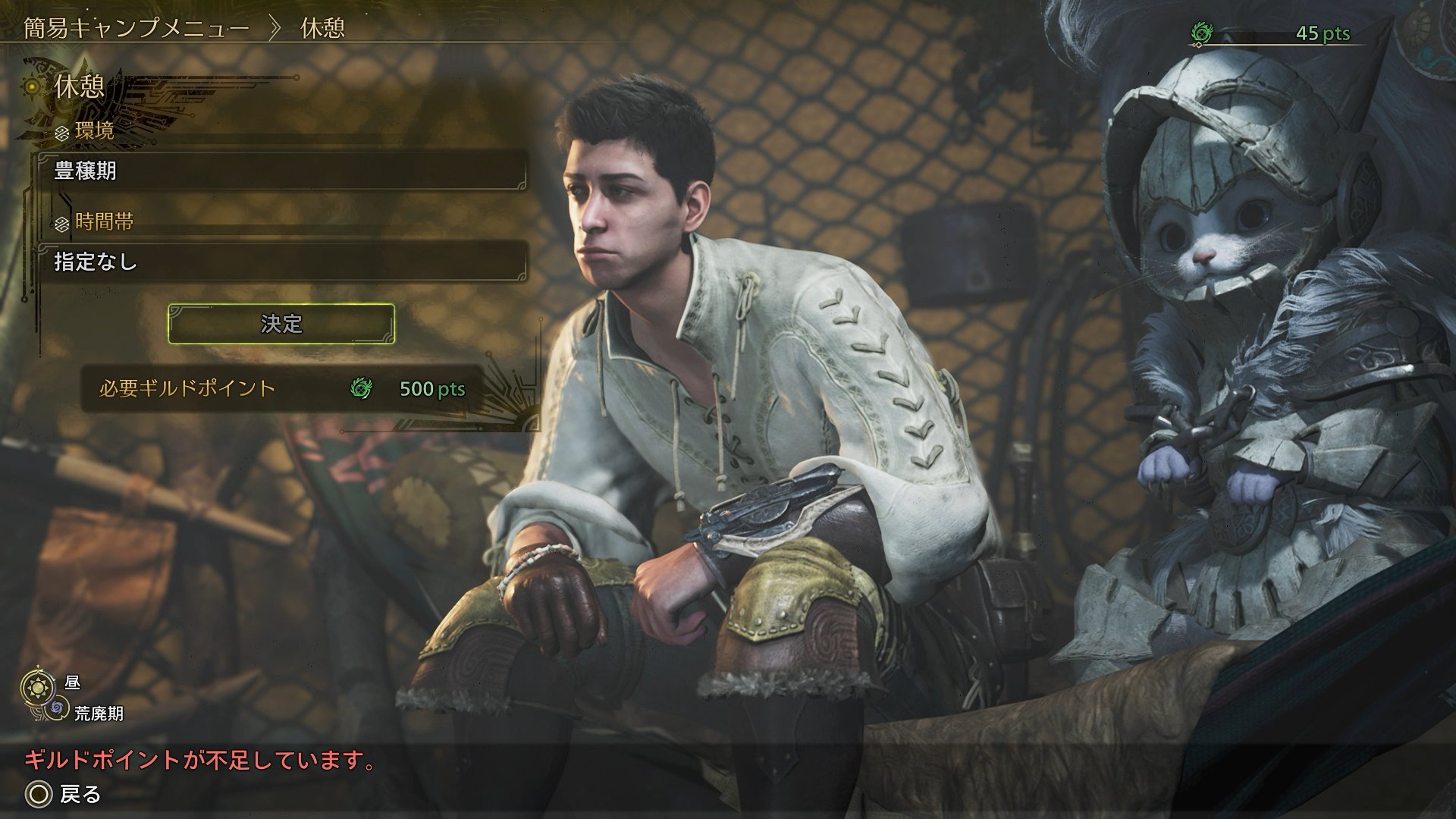 ――が、それらの環境変化を、一瞬に振り直しにできるコマンドが存在する。それが「休憩」だ。主にキャンプで「休憩」のコマンドを選び、ギルドポイントを300払うことで、特定の季節・時間へと、一気に進むことができた。そしてその際に、ランダム系の要素は、全て抽選を再試行させられる。なお、「休憩によるデメリット」は、ギルドポイントを消費する以外には存在せず、例えば何か大事なものが消滅したり、時関経過によって損をしたり、ということは無い。むしろ、ナタの素材集めの進行条件を満たしてくれるため、メリットしかない要素だ。ちなみに、休憩後またすぐ休憩することも可能だ。