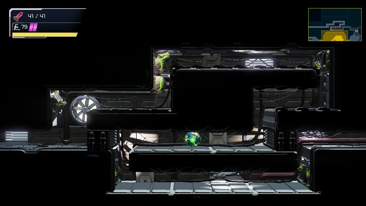 さて、モーフボールは、記念すべき第1作で、開始数秒で手に入れられることを皮切りに、だいたいの作品において、ごくごく序盤で手に入る基本装備であった。しかしながら、『ドレッド』では、ゲームが中盤に入ったくらいのタイミングで入手することになる。今作には、新アクションの「スライディング」があるため、“平面から続く高さ1マスの空間”には滑り混めるのだが、これ見よがししに、少し高い場所に用意された1マスの通路が相手だと、ずっと指を加えて見ているしかなかった。歴代のメトロイドだと、“穴があったら入りたい”という感じであったため、これはこれで新感覚だ。