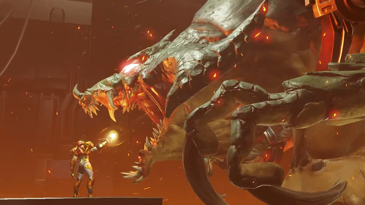 ――しかしながら。サムス的には、何度も倒してきた相手ということで、もはや恐るるに足らないという感じなのであろう。ムービーでは、最初こそ武器を構えていたが、相手がクレイドだと分かると、戦闘態勢を解いて余裕のイケメン立ちをし、リベンジマッチに燃える相手を歯牙にも掛けない。そして、直立不動からのチャージショットを、弱点の口内に喰らわせたところから、バトルが開始する。カッコ良すぎか??