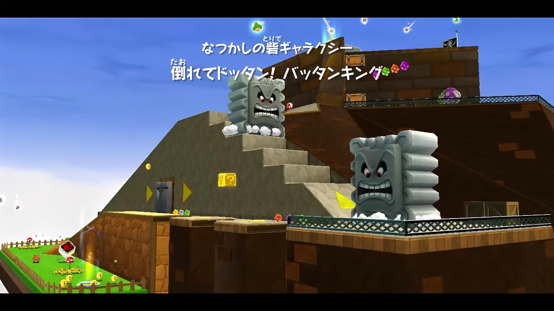 そんなわけで。畜生な1つ目・2つ目のゲートさえ乗り越えれば、この手のステージの恒例として、中盤以降はグッと難易度が下がる。まあそれでも、ドッスンの下をくぐったり、キラーを避けたりなどと、不慣れなジャイロ操作での難関が続くため、決して気は抜けない。それらを耐えて、残り3つのゲートをくぐれば、無事に彗星メダルを獲得してクリアーである。は〜い、おめでとうございました…。