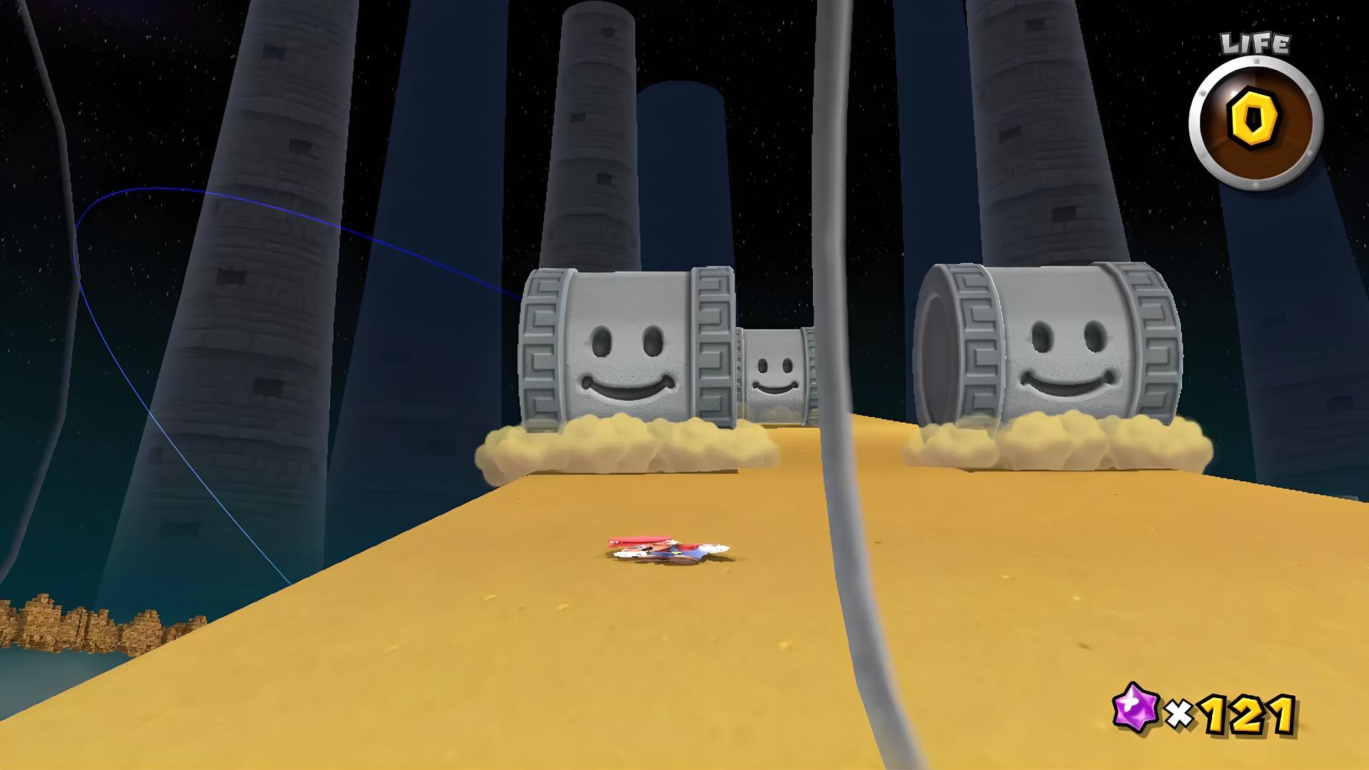 」という感じの、顔のような絵が描かれており、何故か怒っているように見える。そのせいか、急に曲がったり、即死の沼地の中に沈んでみたり、重力変換点で池ポチャさせようと試みたりと、罠ポイントが多い。ただし、そんな高難易度を考慮してか、中盤で、簡単な仕掛けを解除することで、1UPキノコが3つ手に入るポイントがある。1ミスすると再び手に入れられるので、つまるところ、死ぬたびに残機が増えていく。私は、ちょっといろいろと遊びすぎて、残機が1桁にまで減少しており、『サンシャイン』ぶりにマリオでゲームオーバーになってしまうのではないかと危惧していたので、3UPは非常に助かるというものだ。