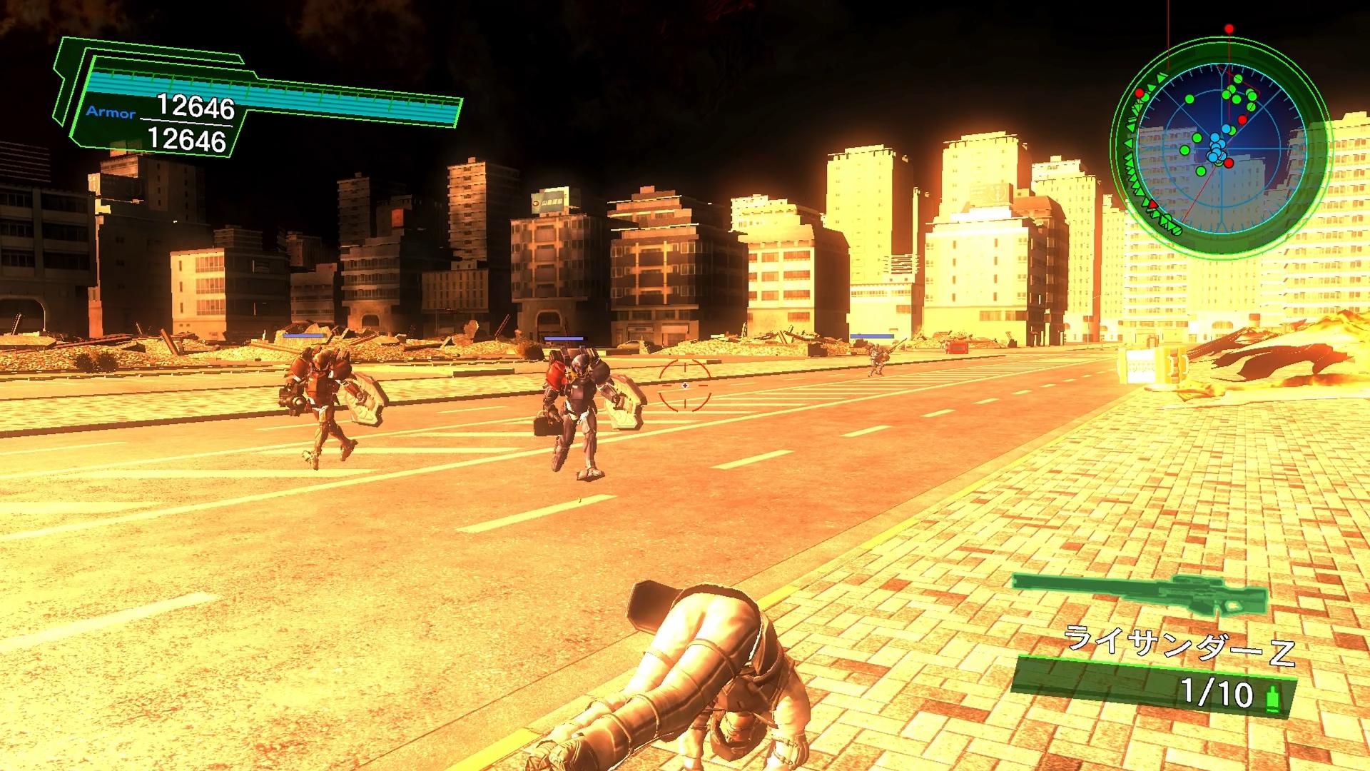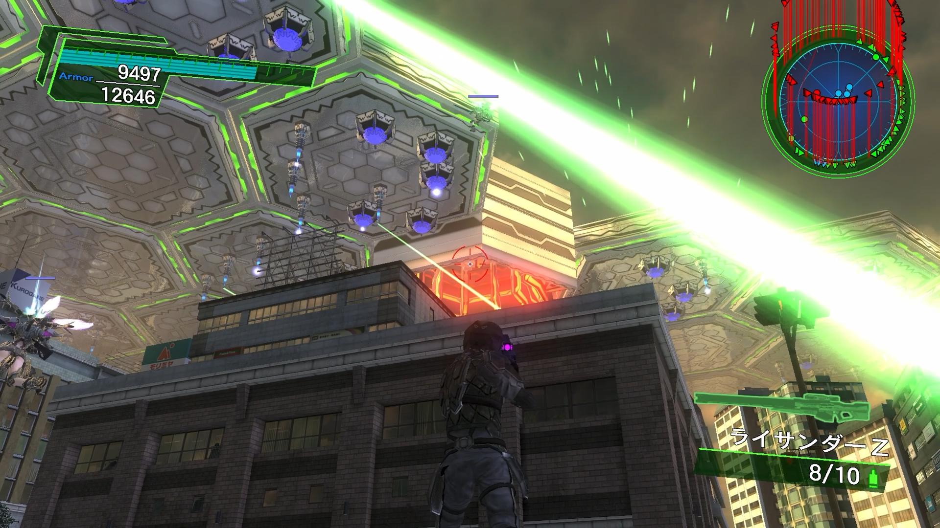 ――というわけで。この第1波で重要なのは、慎重に進めることだ。DLCラストの「星の牢獄」とは異なり、本ミッションでは味方兵士が登場するのだが、MAPの各所に点在しており、しかもプレイヤーが近付くまで登場していない。そういうわけで、初期位置からあまり動かずにゴリ押しをしようとすると、全く仲間と合流できず、全ての砲台がプレイヤーを狙い、右往左往して燃えカスとなってしまう。逆に、味方兵士については、この最終ミッションまで生き残っているだけのことはあり、異様なまでに精強で、なんとおフェンフェンですら生き残るというの尋常ではない耐久力を誇る。凄まじく頼りになるので、何か特別な補正でも掛かっているのかと、実際に射撃して耐久力を計測してみると、HP7000程度であり、特に強化係数は掛かっていないようだ。純粋に彼ら自身の能力である。忘れがちであるが、このゲームのタイトルは「地球防衛軍」、仲間と共に戦うのが重要なのだ。