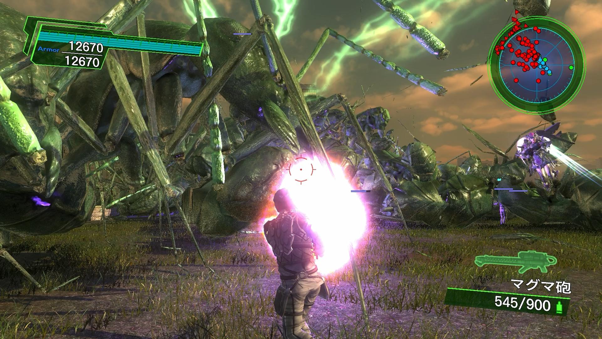続いては、ガラッと方向性を変えて、地球防衛軍シリーズで、よく議論の種となるゲームデザインについて触れてみよう。本ミッションは、ディロイを投下する輸送船が2隻と、そして黒蟻巣・赤蟻巣が1個ずつ存在し、それらをヘクトルが護衛しているという、それだけの内容だ。味方は存在しないものの、強化された「ストリンガーJ9」を使い、まずは増援ポイントを狙って、敵を削っていけば良い。