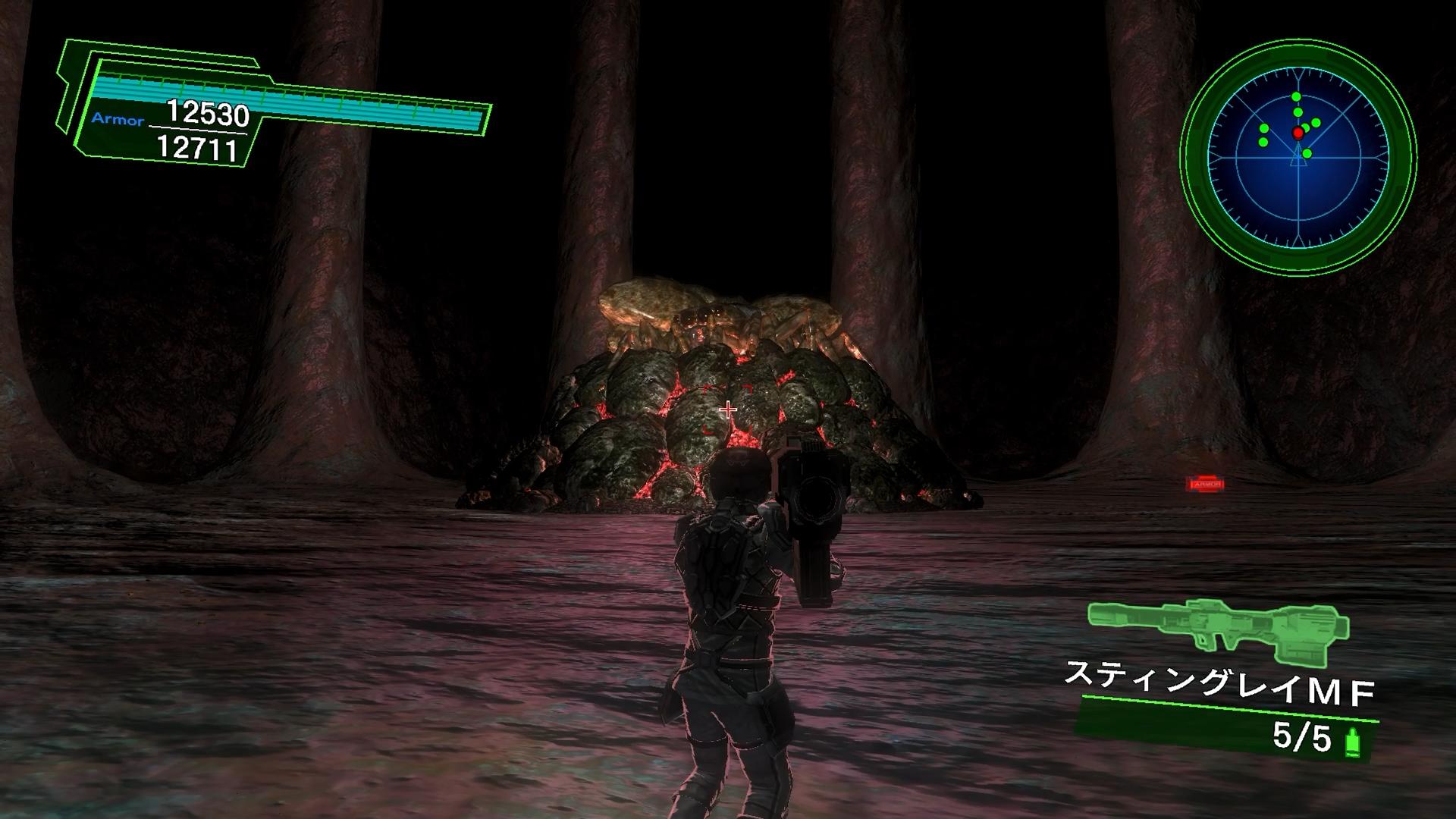 というわけで。下位難易度と同じく、今回も爆発物を片手にミッションへと挑む。「スティングレイMF」を使い、出てきた蜘蛛を巣ごと攻撃していけば、相手の大規模な拡散は防げる。もっとも、そのままドカンドカン吹き飛ばしているだけだと、ダメージ効率は良くない。しかしながら、「蜘蛛40体の補充間隔」は長いので、途中はAF100で射撃をして良い。やり込みプレイのように、わざわざ時間を数えなくとも、蜘蛛の頭が見えてから爆発物に切り替えれば十分だ。数体をのがしたところで、初期体力プレイでもない限り、それで仕留められることは無いであろう。