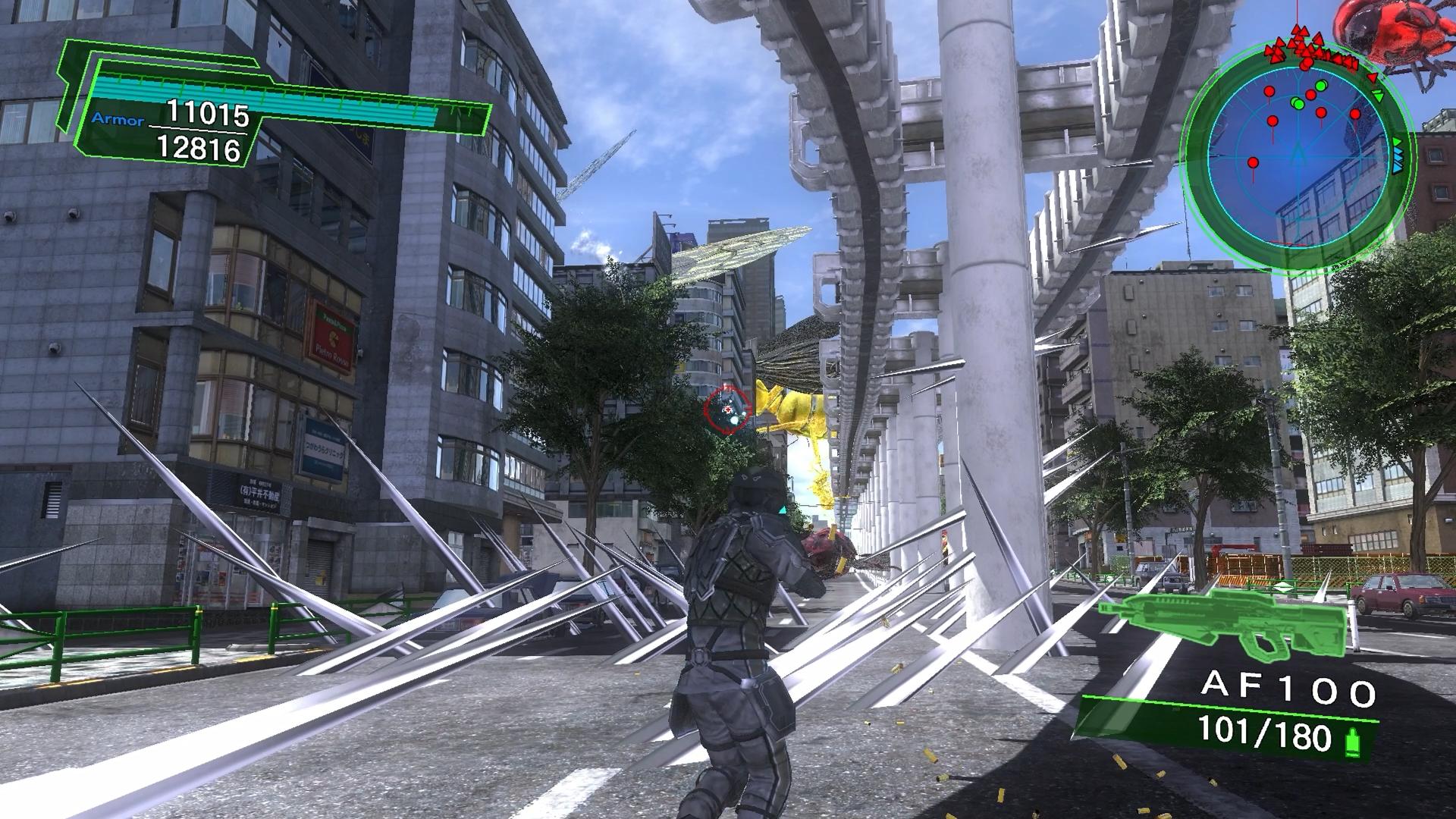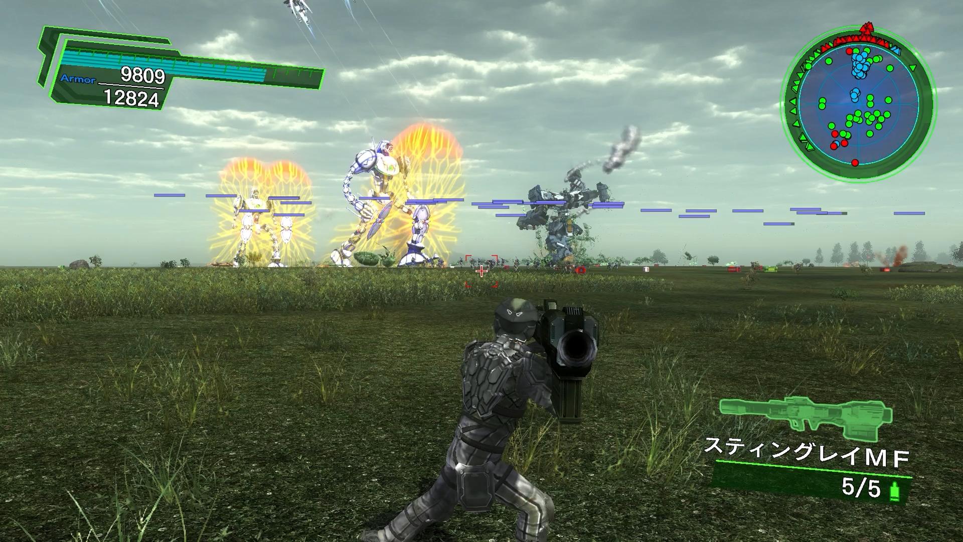 さて。本ミッションでは、開幕の黒蟻を除いて、敵は待機モードなので、少しずつ敵を呼び寄せれば余裕であるが、いつもながら、「できたらとっくにやってる」というやつである。だいたい、どこを叩いても、大型×2〜3体を含めた大群が反応し、どうしようもならなくなる。ただし、そのまま複数の金女王と戦うような内容にすると、『4』魔窟と化してしまうので、本ミッションでは弱体化補正が掛かっているようであり、フュージョンブラスターを使えば、気持ち少なめの弾数(500発程度)で撃破可能だ。乱射でも3体は金女王を撃破可能と、なかなか長持ちしてくれる。死んでしまっては元も子もないため、やばいと思ったら、すぐに使っていくことにした。