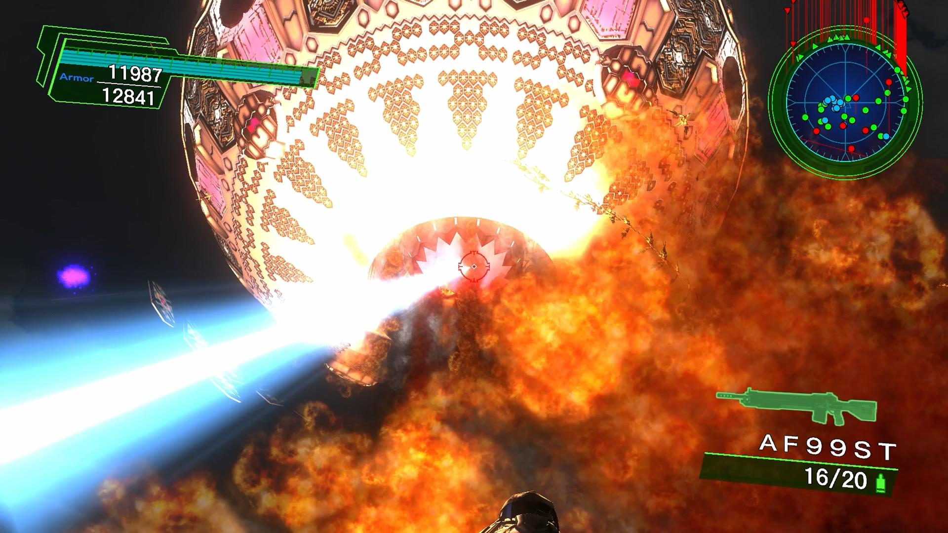 ということで。最終的な攻略法として、まず序盤は仲間を集めつつ適当に戦い、パネル砲台も適当に落としていく。ジェノサイド砲も、HARDESTと同じように、マップ角以外からなら狙撃できるので、破壊して、弱点が現れたら、すかさずノヴァバスターZDを打ち込み、AF99STで追撃する。すると、低高度段階をスキップし、最終形態へと移行させられるので、あとは雑魚敵を味方に押し付けつつ、マザーシップをゴリ押しする。これでも結局、緑蟻は出てくるのだが、そのタイミングを後回しにできるメリットは果てしなく大きい。これで勝てた。さすがに、HARDESTよりはギリギリの勝負になるものの、今回は1回勝てればOKなのだ。