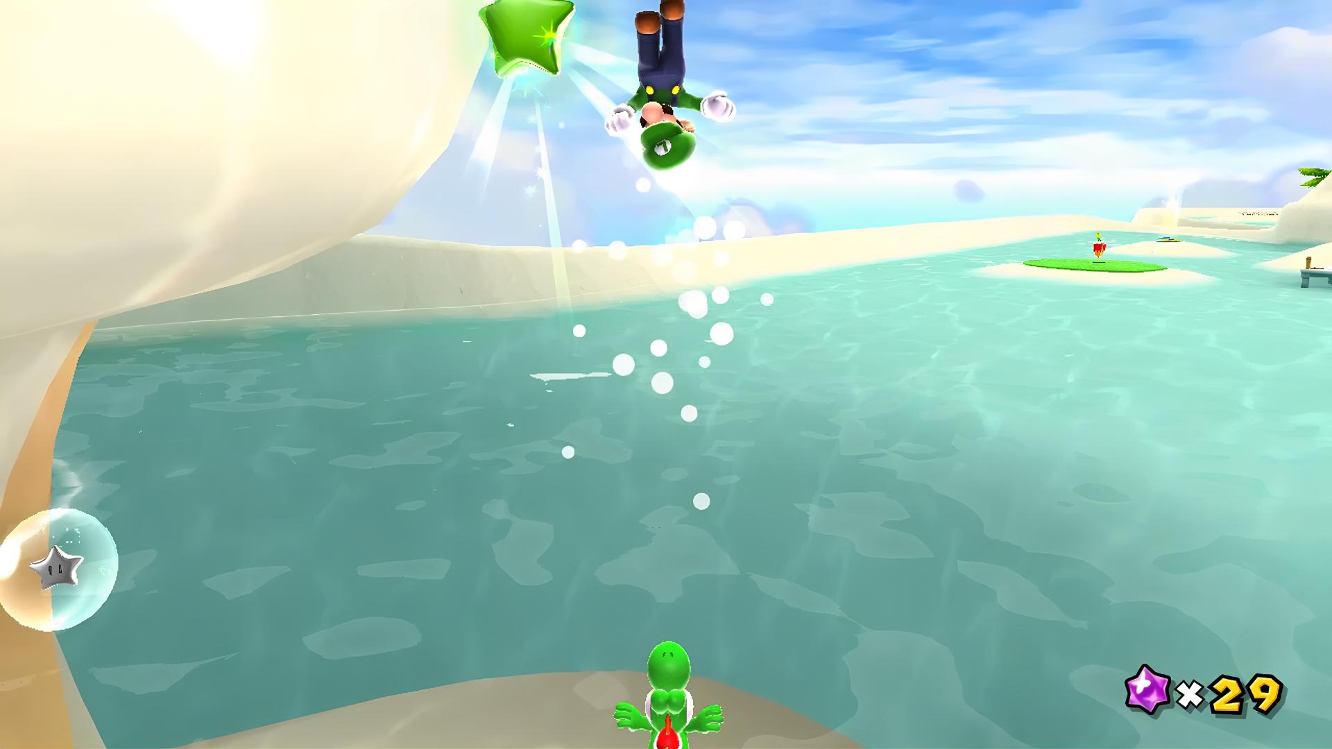 ★1:2Dマップから3Dマップへ移行するところでキラキラ音がするのは分かるが、ハチマリオを使って上のほうに飛んでいっても見つからない。遠くのエリアに置かれているオブジェクトが、昔のゲームのリマスターらしく、急に出たり消えたりするのが観測できるだけである。が、よく見ると、赤い風船から光が漏れていたので、そこに体当たりをすることで、隠れていた緑スターを獲得できた。