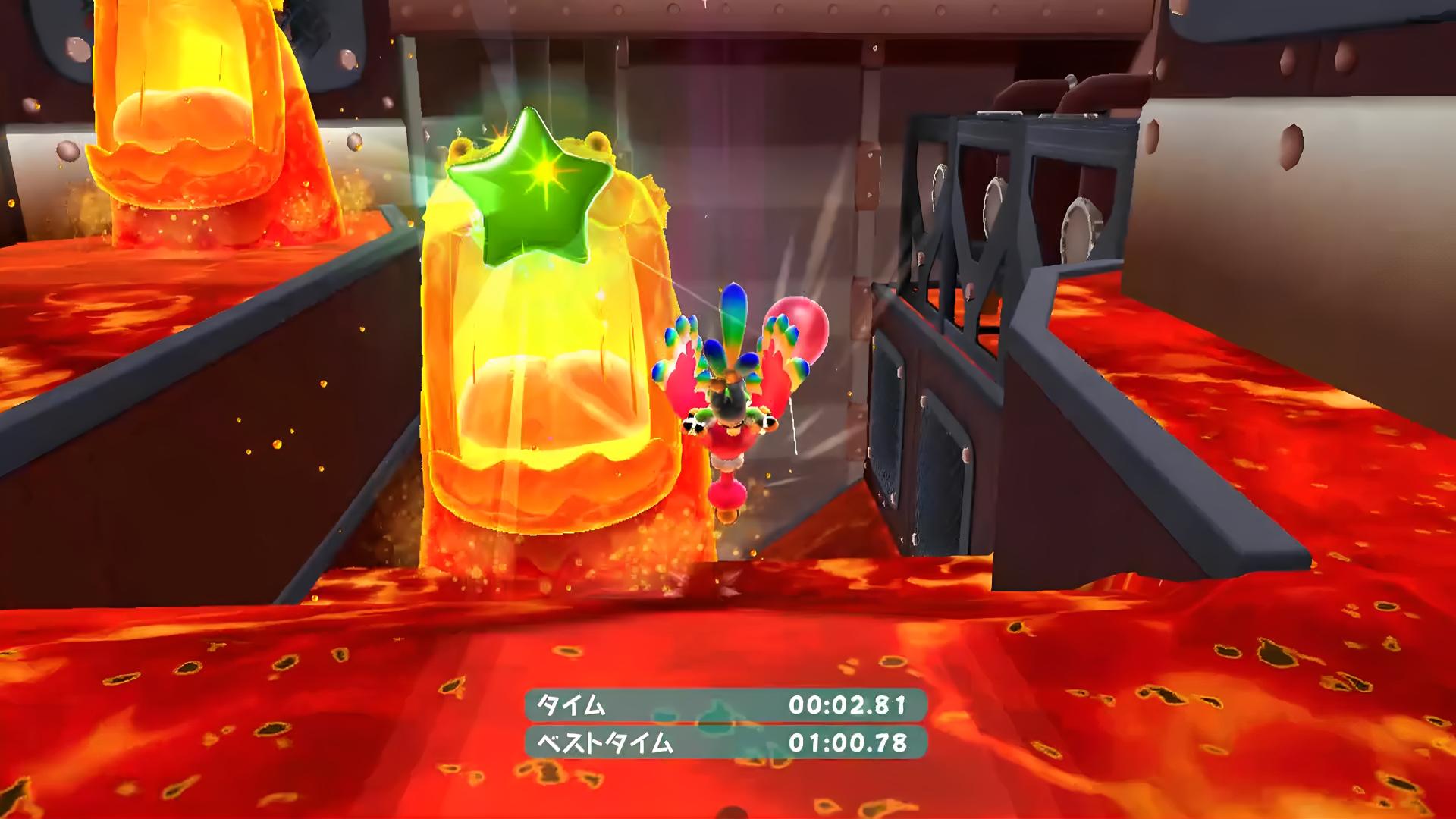 ★1:開幕から全面が溶岩に覆われており、最終ワールドであるW6よりもよっぽどラストっぽい雰囲気である。その1個目の緑スターは、さすがに広大な第1エリアのどこかには置かれているだろう…と、凍結させてから探し回ったところ、エリア中央に置かれているミニ火山の火口に置かれていた。通常、ただの背景であり、普段なら全く行く必要の無い場所のオブジェクトだ。やりおる…。