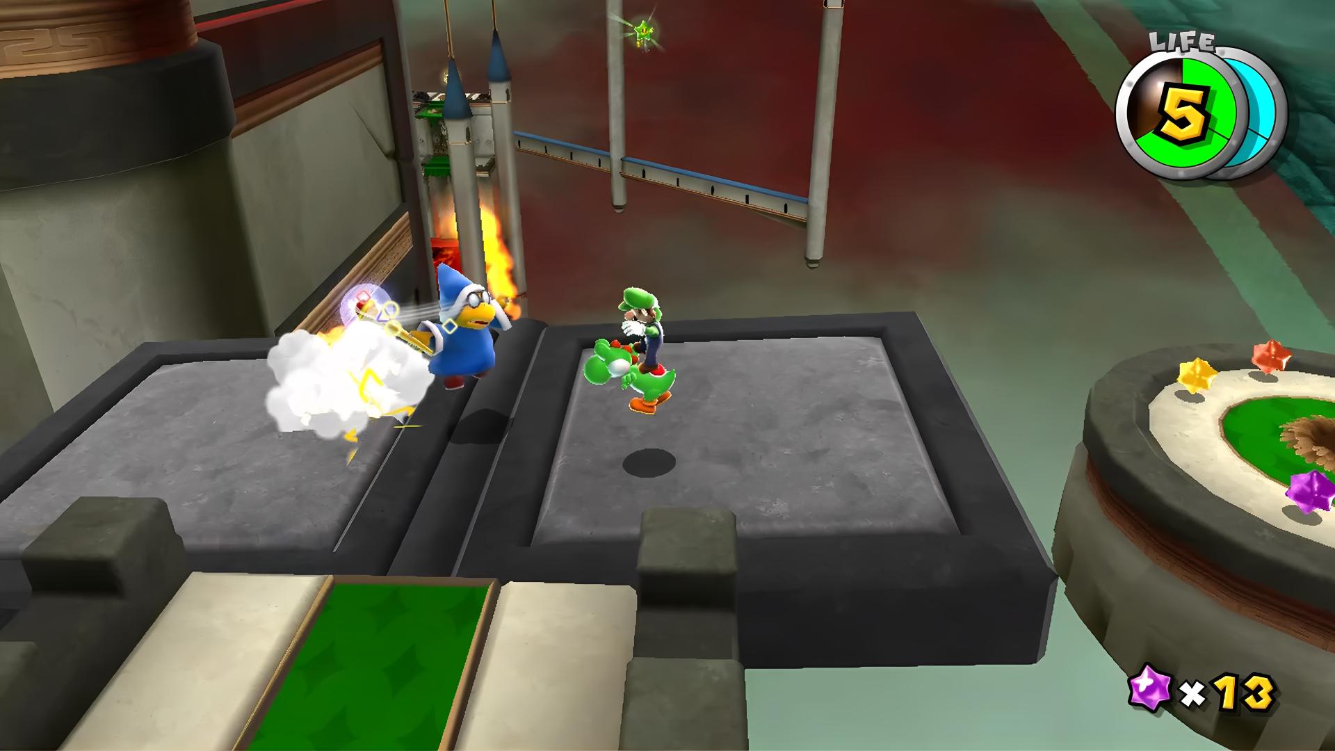 ★1:開幕の、綿毛を使って滑空していく地点に置かれている。カメラは、上から見下ろすような感じであり、珍しく立体関係が分かりやすいので問題ない。ちなみに、ここでは、溶岩弾が対空砲のように打ち上げられており、それに当たると綿毛が燃やされて★死★のため、それを避けていくというゲーム性になっている。3Dアクションなのだから、“立体感が分かる構成になっている”のは、考えてみると当然だわな…。