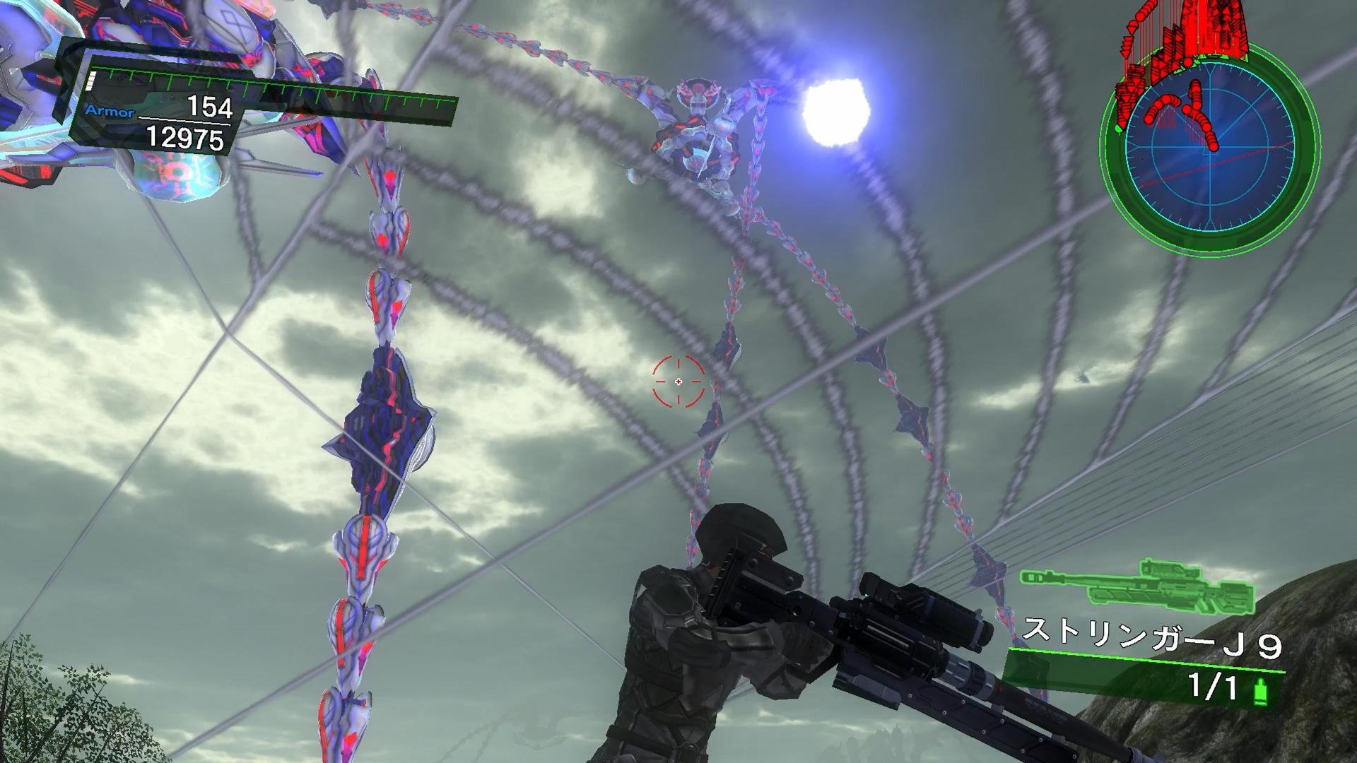 というところなのだが、それを最悪な手段で邪魔してくるのが、前述のヴァリアント・レタリウスである。原種の時点で地球防衛軍を代表する害悪モンスターであったが、このミッションではレタリウスの嫌なところが大結集している。まず、ただでさえ時間との戦いなミッションなのに、レタリウスの糸に引っかかると、自由な移動ができなくなる。このミッションでは、四方八方から糸が投げつけられ、ハッキリ言って能動的な回避は不可能だ。“既に何かの糸に引き寄せられていると、他の糸には引っかからない”という操作系理論によって、いい感じの位置に居る相手に引っ張ってもらうことを祈るしかない。