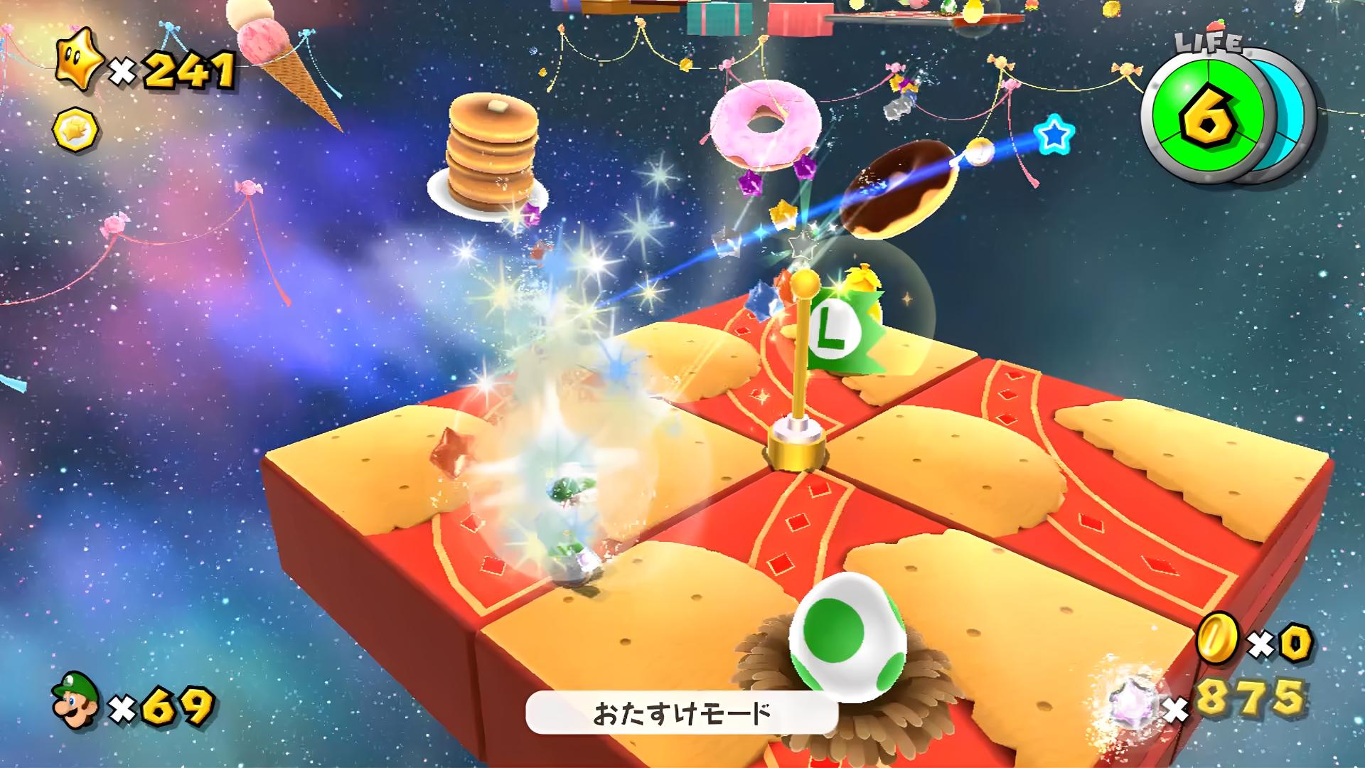 …しかし、それだけではない。まず、スイッチ版においては、「おたすけモード」という難易度緩和策が用意されている。いわゆるEASYモードであり、私は基本的にこの手の要素を純粋な攻略には使わないものの、「稼ぎプレイを楽にする」という用途では、むしろ積極的に活用案を考えていくタイプだ。そして、このマリオギャラクシー2でも、まさかの「おたすけモード」が稼ぎに転用可能だ。というのも、おたすけモード⇔通常モードは、ゲーム中、いつでも変更が可能だが、ステージ内で変える場合、「最後に通ったチェックポイントに戻る」という処理になる。そしてこの際、取得したスターピースはそのままである。つまり、この「スイーツミステリーギャラクシー」の1本目のチェックポイントで、窓拭きをしながらオリジナルモードとおたすけモードを往復することにより、かなりのペースでスターピースを増やしていけるのだ。もはや、これはゲームなのかという感じであるが、まあ、稼ぎプレイなんてそんなものである。