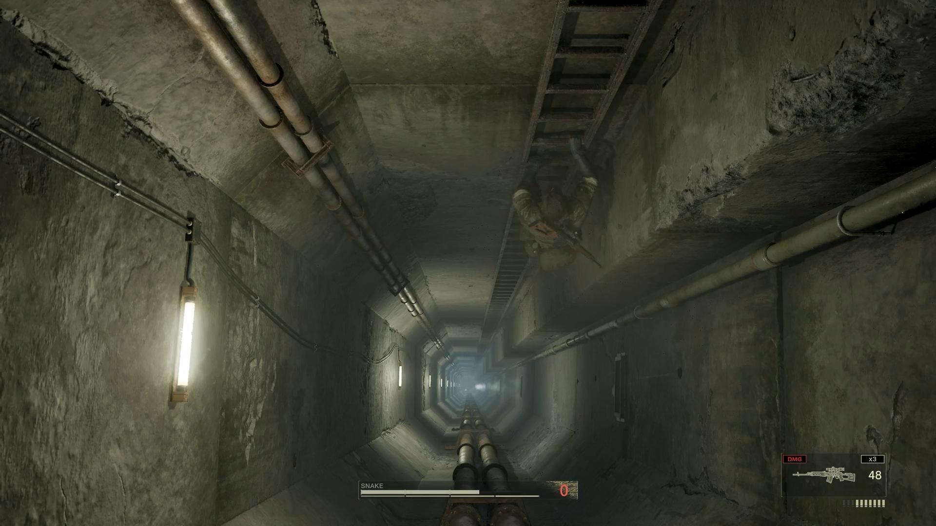 EATER」のボーカルが、やや反響するような音響で、1コーラスだけ流れる。長いハシゴ登りを退屈にさせないための演出と思われるが、そもそもこのハシゴ登りを用意しなければ良い話なので、やはり意味が分からない。たぶん、スタッフに聞いても、これは絶対に答えない気がする。腕を切り落とした芸術品のように、謎なこと自体に意味があるタイプの要素なのだ。もちろん、MGSΔでも、寸分の狂いもなく、原作再現がされている。