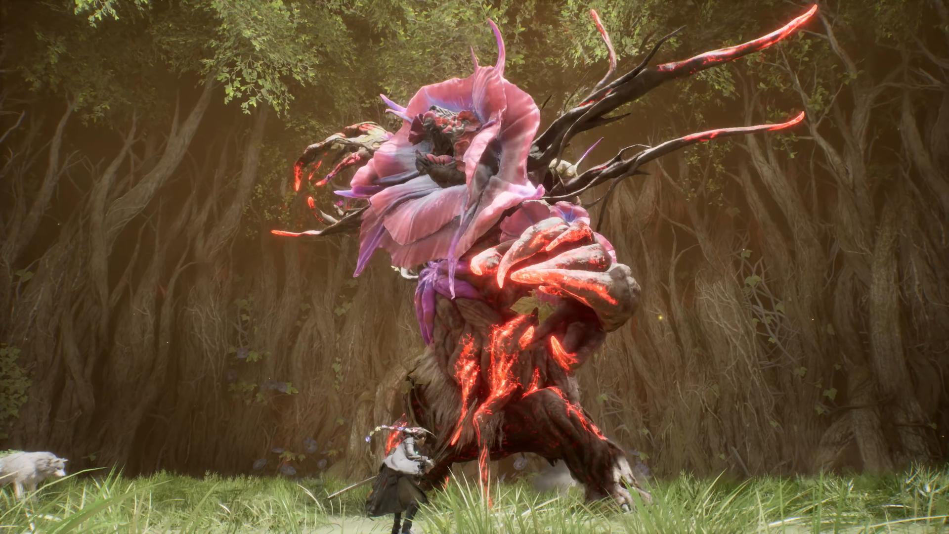 さて。このゲームにおいて、「ヌシ」と呼ばれるボス敵は、花の襟を付けた樹の獣であり、「モンスターハンター」のようだ。“狼が主要キャラ”というコンセプトなら、「大神」や「メタルギアソリッドV:ザ・ファントムペイン」「ファイナルファンタジー16」などが存在する。崩壊した世界や、現代文明の存在しない日本という世界観は、「ホライゾン」や「ゴースト・オブ・ツシマ」などが近いだろう。しかし、これら理詰めの分析を抑えて、本作の映像を見たときに私が最初に感じたのは、「あ、これステラーブレイドだ」である。