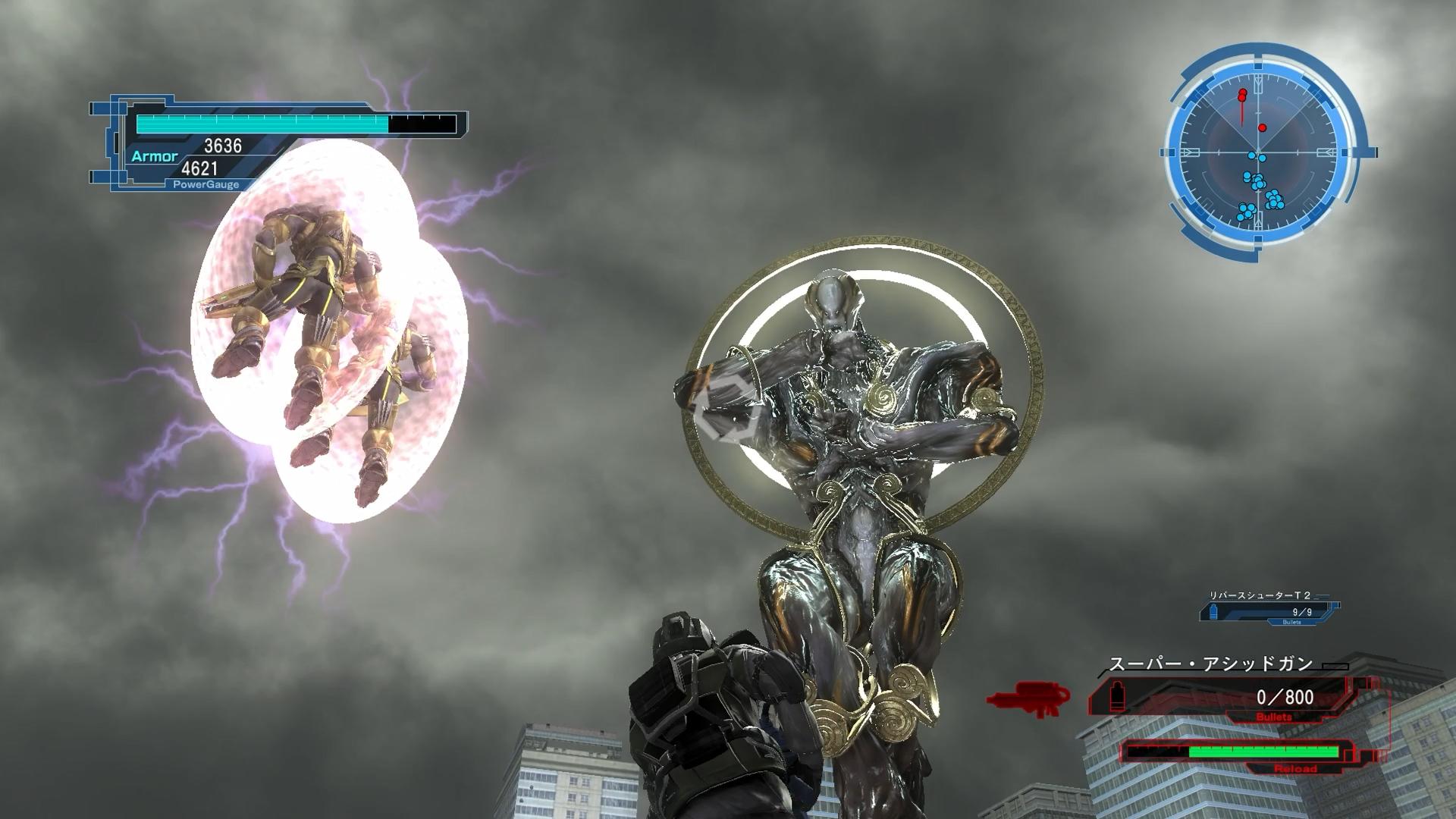 特定無線が終わるまで、敵の体力減少に下限があるようなのだ。何度も戦っていくと分かるが、例えば第2形態→第3形態への変化は、必ず、声かわいいオペレーターが「勝たなければ…なりません」と言った直後になる。わざわざ“EASYにブレイザー”などと極端な構成をするまでもなく、FF7リメイクのように、「演出が特定段階に進むまで、HPが減少しない」となっていることが察せるのだ。よって、ある程度HPを減らしたあとは、撃っても無駄なのである。と言っても、敵に体力ゲージなどは表示されておらず、弾数も無限なため待っていても仕方なく、結局は撃たなければならないのだが、何と言うか、射撃ゲームで攻撃が無駄になるというのは、気持ち良いものではない。無線音声は、それなりに頑張ってはいるが、地球防衛軍の稼ぎは、10回20回と重ねていくものであり、どのような演出であっても、さすがにダレてしまうのである。「拘束しろ!」って、いや、無理だ!!