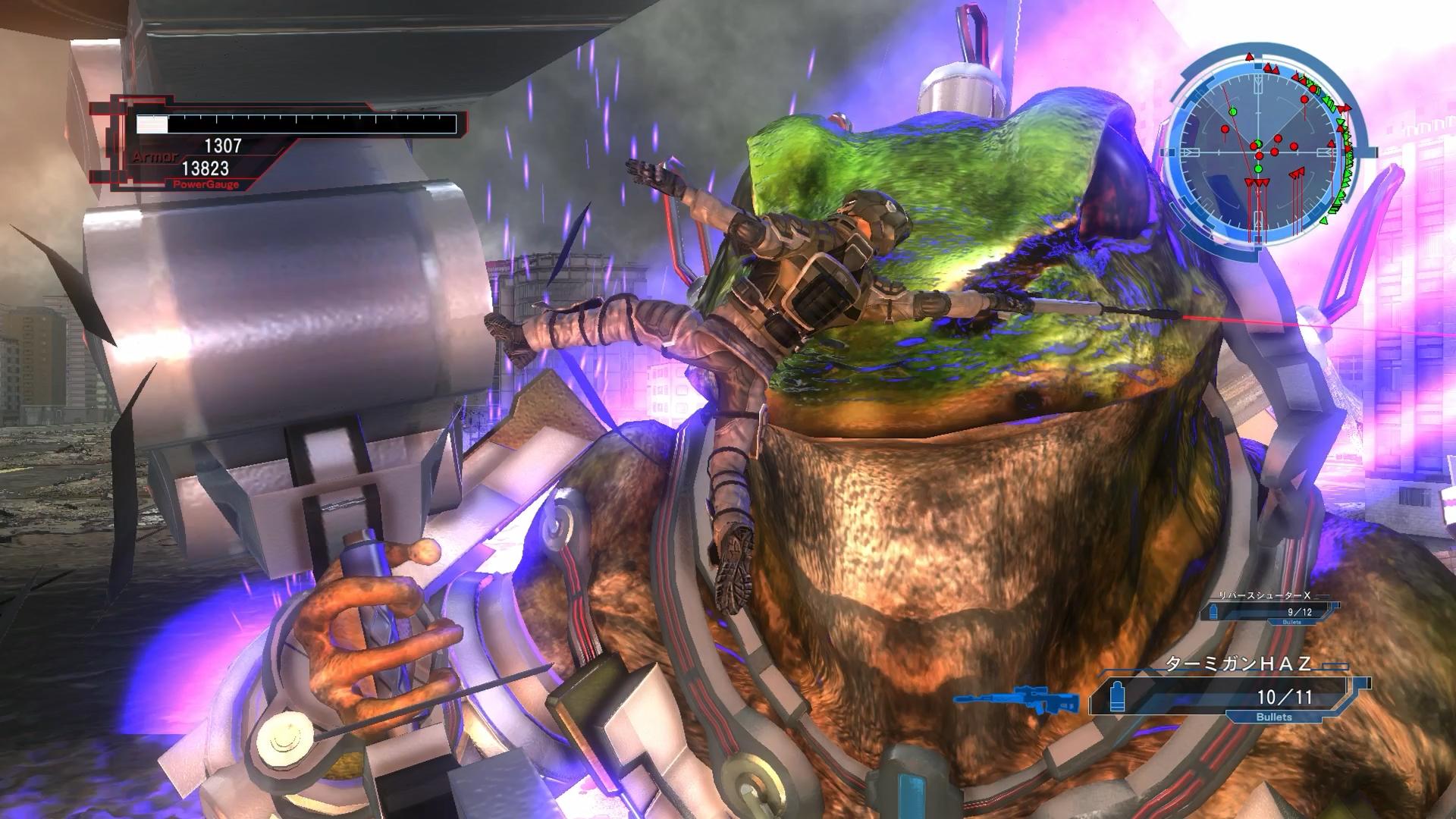 → 残った鎧カエル、の順で倒せば良い。なお、マザーシップ本体を撃つと、鎧カエルは必ず“こちらを発見している状態”になるようであり、凄い仰角で多連プラズマ砲を撃ってくるが、当たらないのでどうということはない。最後は、ライフル型の鎧カエルを残してアイテムを回収し、クリアである。