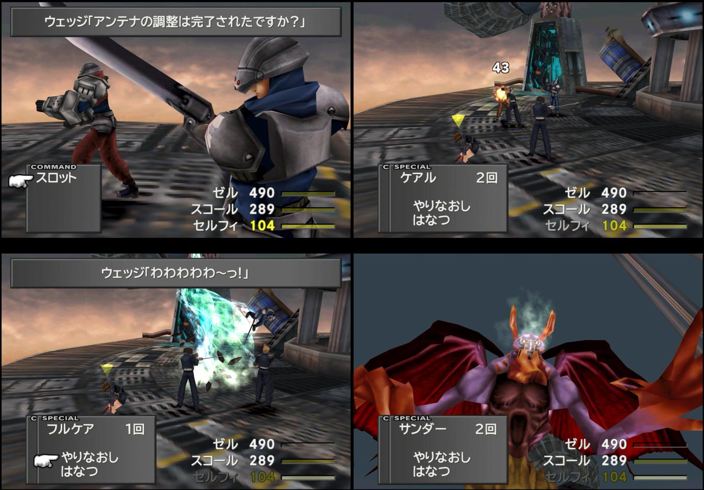 ちなみに。今回は、「ジャンクションなしで敵を破壊まで持っていく」というチャレンジも行ってみた。方法はシンプルで、まず1回目は普通に転倒させ、その後は「敵の転倒中に、スロットで高威力の魔法を予約しておき、修理完了直後に即転倒させる」ということを狙っていく。敵は、エルヴィオレほど精神が高くはなく、雷属性への1.5倍弱点を持っている。そのため、「メテオ」「アルテマ」はもちろん、「サンダガ」でも約600ダメージを与えられ、2回以上ならば転倒へと持っていける。スコールとゼルの特殊技を自動にして時間を稼ぎ(ゼルは専用コマンド枠が表示されるため意味が無かったが…)、割と簡単に、修理不可の状態(故障カウンターが「5」の状態)にまで持ち込むことができた。