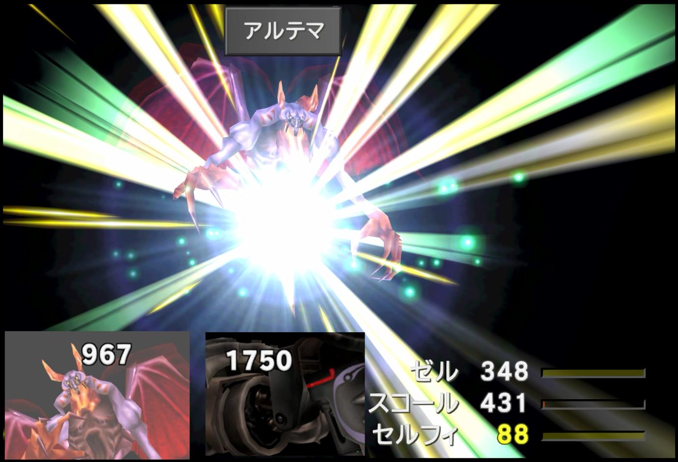その後、めげずに、エルヴィオレ登場時の演出を使い、更にスロットを回していくと、「アルテマ×2」と出会うことができた。無論、最良は「アルテマ×3」であるが、これまではメテオやアルテマすら出せていなかったので、2回でも十分に良い技だ。前述の通り、私の縛りでは「たたかう」を制限していないため、まずアルテマで削って、残りを打撃で倒しきれば良い。