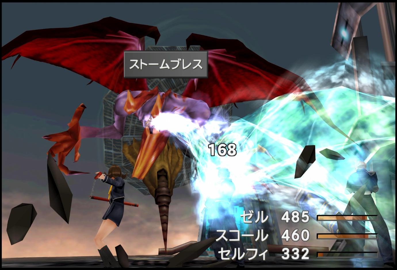 ――そうして戦っていくと、敵の必殺技:「ストームブレス」が発動し、全員が約160のダメージを受けた後あたりで、相手を撃破することができた。ふう…。なかなか苦労はしたが、敵にもしっかり技を出させるプロレス的な面白さに加えて、「ジャンクションなしプレイでの『たたかう』の利便性」というものを検証できた点は良かった。一方で、リマスター版におけるレスポンスの悪さは、今後も残る問題として、先行き不安になるものであった。