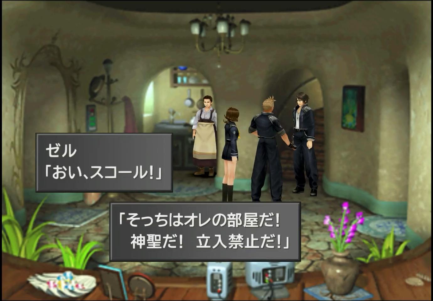 ――ちなみに。シナリオを進めると分かるのだが、ゼルは孤児であるため、この母は本当の母親ではなく、義母というやつである。このことについては、現時点では明言されていないが、特に隠されているというわけでもないらしく、例えば武器屋の前にいる住民に話しかけると、ゼルに対し「ディンさんに、顔を見せていけよ。」(ゼルのフルネームは「ゼル・ディン」)という、違和感のあるセリフが聞ける。注意深いプレイヤーなら、この時点で、ゼルの家庭状況について、察せるところがあったかもしれない。