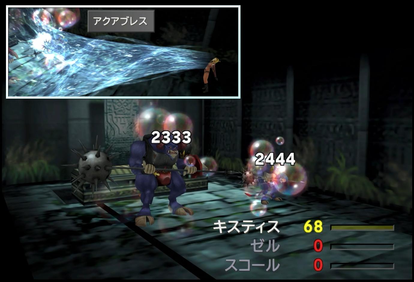 マジで「ジエンド」を使って倒してやろうかなどと思ったこともあったが(実際にはアダマンタイマイに使った)、それよりもスマートな方式が「アクアブレス」だ。ご存じ、序盤から中盤に掛けてのキスティスの主力技であり、水属性を1.5倍弱点とするBGH251F2相手が有名だが、それ以外の相手にも普通に使っていける。他の青魔法と比べた場合、「超振動」「電撃」は火力で、「ファイアーブレス」は入手難易度で、この「アクアブレス」に勝てていない。フォカロルを倒して「水の結晶」を入手することにより、キスティスの使い勝手に天と地ほどの差が出てくるのだ。くさい息と違って、こちらは清涼感のあるエフェクトなのも素晴らしい。