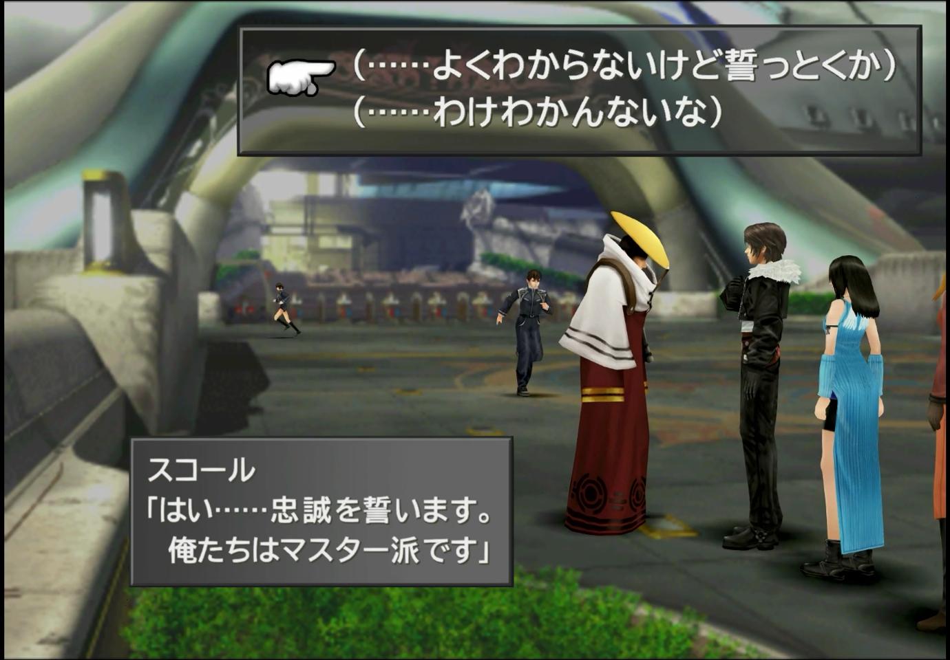 というわけで。マスター派を選んでぐるりと一周し、全てのイベントを回収する。ここで面白いのは保健室であり、サブキャラの「ニーダ」がいる。FF8ファンにとっての知名度とは異なり、作中世界では空気キャラということで、スコールからも存在を忘れられているため、三沢大地的な扱いなのだろう。念のため言っておくと、スコール・ゼル・セルフィと同時に合格した4人目のSeeDであり、後にバラムガーデンの操縦士となる。スコールたちを含め、多くのSeeDたちが出払っている中、彼は精鋭と言える存在であり、しかもこのあとガーデン浮上からF.H.終了までSeeDを補充できるシーンはないため、彼が居残っていたことが、バラムガーデンのその後を決めたのである。まさにガーデンを動かす男、空気空気と言われている奴は意外と目立っていて、それすら話題に挙がらない奴が真の空気だったりするのである。