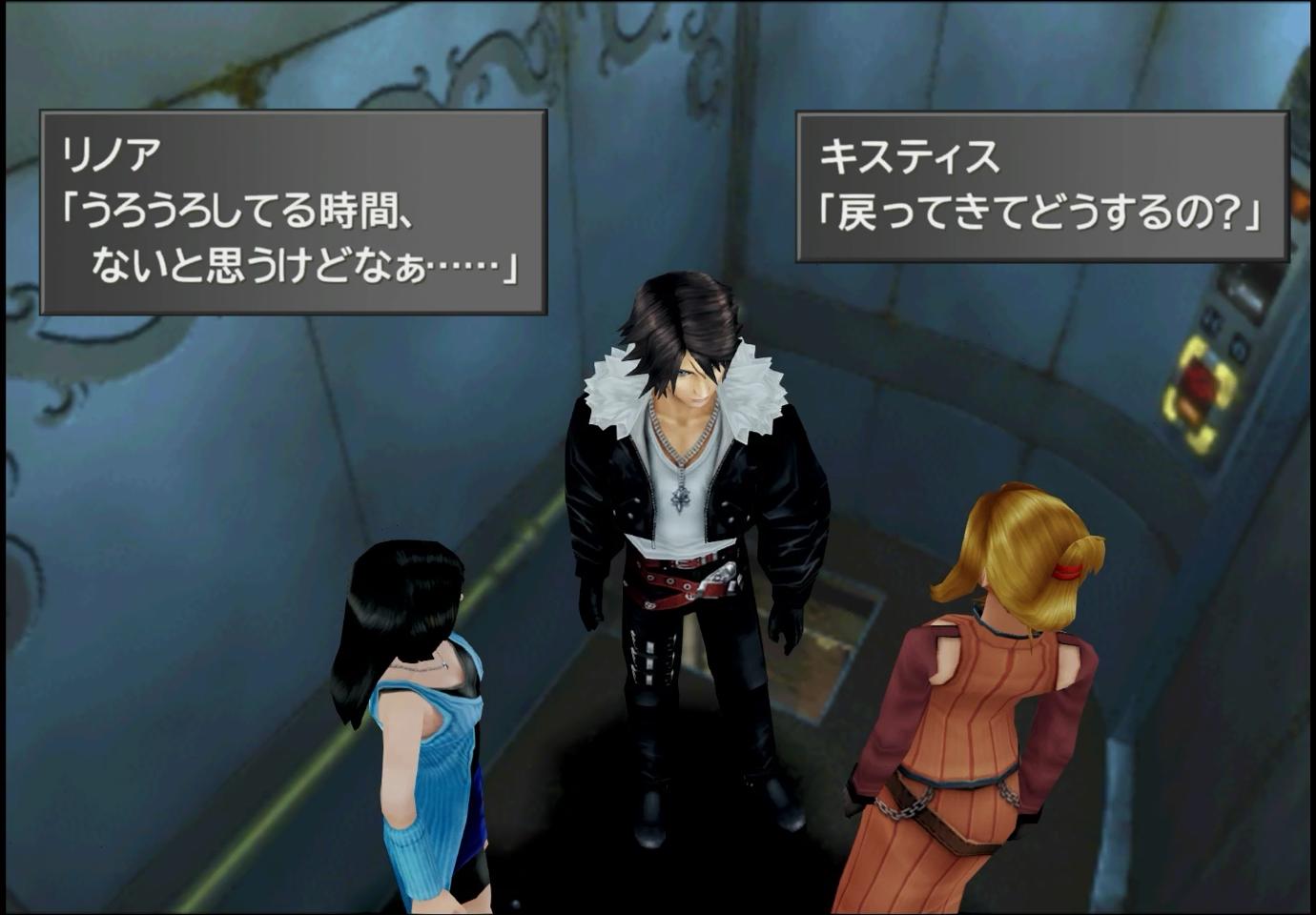 …さて。ここで、多分ほとんどの人が知らないポイントを挙げてみよう。このエレベーターは、非常ハシゴを少し降りると落下してきてしまい、ギリギリのところで横道に逃げ込む…というのが流れとなるのだが(移動が遅れてゲームオーバーになったりすることはない)、落下し始める前に上に戻ると、再びエレベーターの中に入ることができる。もちろんエレベーターは動かず、イベントは進まないのであるが、仲間2人に、新しいセリフが用意されている。私は女性陣2人を連れて行ったが(セルフィは固定ミサイル基地なので除外)、リノア・キスティスから冷笑されるスコールは、やっぱりおもしれー男である。