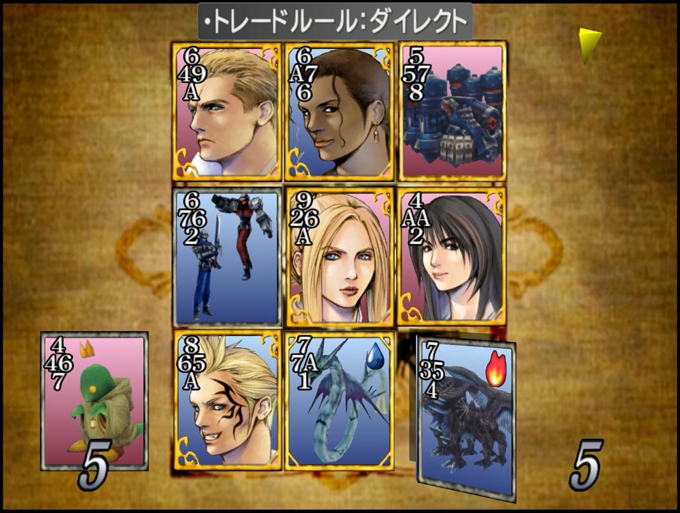 ちなみに。私は、スコールたちのガーデンチームが始まった際に、一度バラムに寄り道し、カードクイーンでトレードルールをフルにした。では、いつからトレードルールが「ダイレクト」になったかというと、訓練施設でCC団のジョーカーと対戦してからである。CC団のジョーカーは、謎にD地区収容所にも潜入していたため、そこからガルバディア経由で「ダイレクト」の感染が広がってしまったのかもしれない…と思ったが、D地区収容所でのルールは「ディフ」であったため、やはり意味が分からない。何はともあれ、「トレードルール:ダイレクト」は、「プラス」「ランダムハンド」並の害悪ルールなので、不用意に広めないよう、皆さまも気をつけていただきたい…。