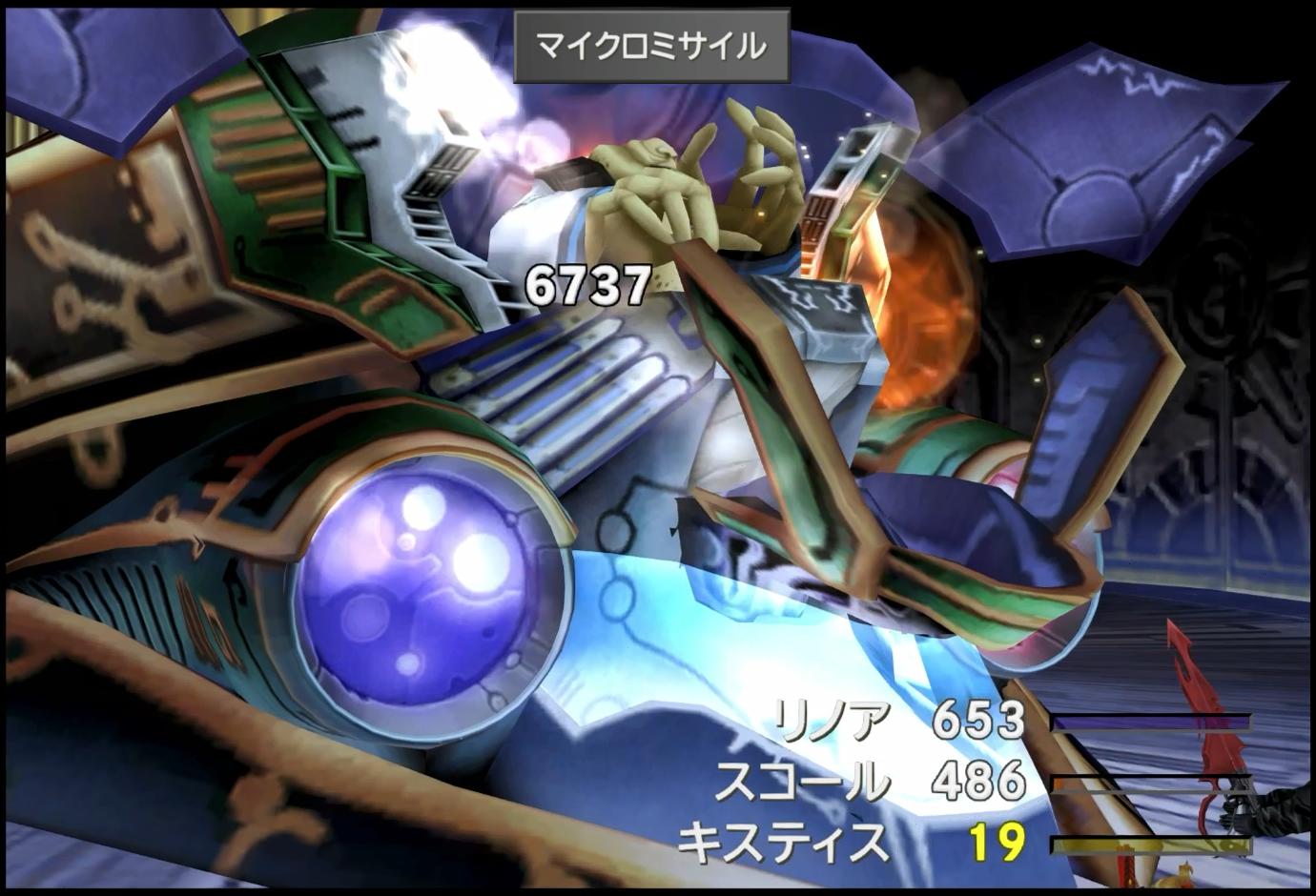 そうして、最大ダメージのマイクロミサイルが決まったら(決まらなくても)、あとはひたすら、ノーグ本体を「たたかう」で攻撃していく。敵の火力は高めだが、「何もしない」を選ぶことがあり、HP満タンのキャラを一撃死させられるほどでもないので、スコール&リノアが狙われ続けてくれれば、何とかなってくれる。