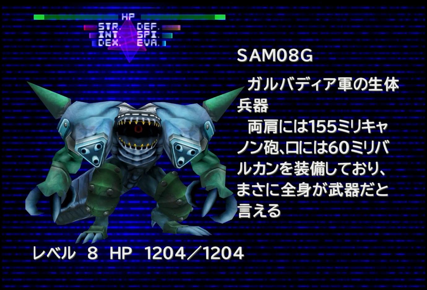 さて、ここでのポイントは、二足歩行のワニのようなロボットである「SAM08G」から、「牙式連発銃」というアイテムを手に入れられることである(最速はミサイル基地)。これは、キスティスの青魔法アイテムであり、「ガトリング砲」を覚えられる。青魔法で唯一の物理攻撃技であるが、FF8では、基本的に「物理攻撃はパラメーターに、魔法攻撃は威力数値に」それぞれ強く依存する傾向がある。よって、低パラメーターとなるジャンクションなしクリアーでは、物理攻撃は厳しい扱いとなる。ならばと、通常プレイで力を強化して使おうにも、男3人の、それぞれ個性的な暴力的打撃力の前には、単発技では勝負にならない。「魔法には極めて硬いが、物理攻撃は効きやすい相手」というのも、特に思いつかないので、たぶん居ないのだろう。もし居たとしたら、「溶解液」で体力0を狙ったほうが良い。せめてガトガトガトガトと連発技なら何とかなったかもしれないが、単発技ではどうにもならないのである。ちなみに、アルティマニアによると、目から弾丸を発射しているらしい(P.70)。メーザーアイやくさい息より凄く、何と言うか…何?