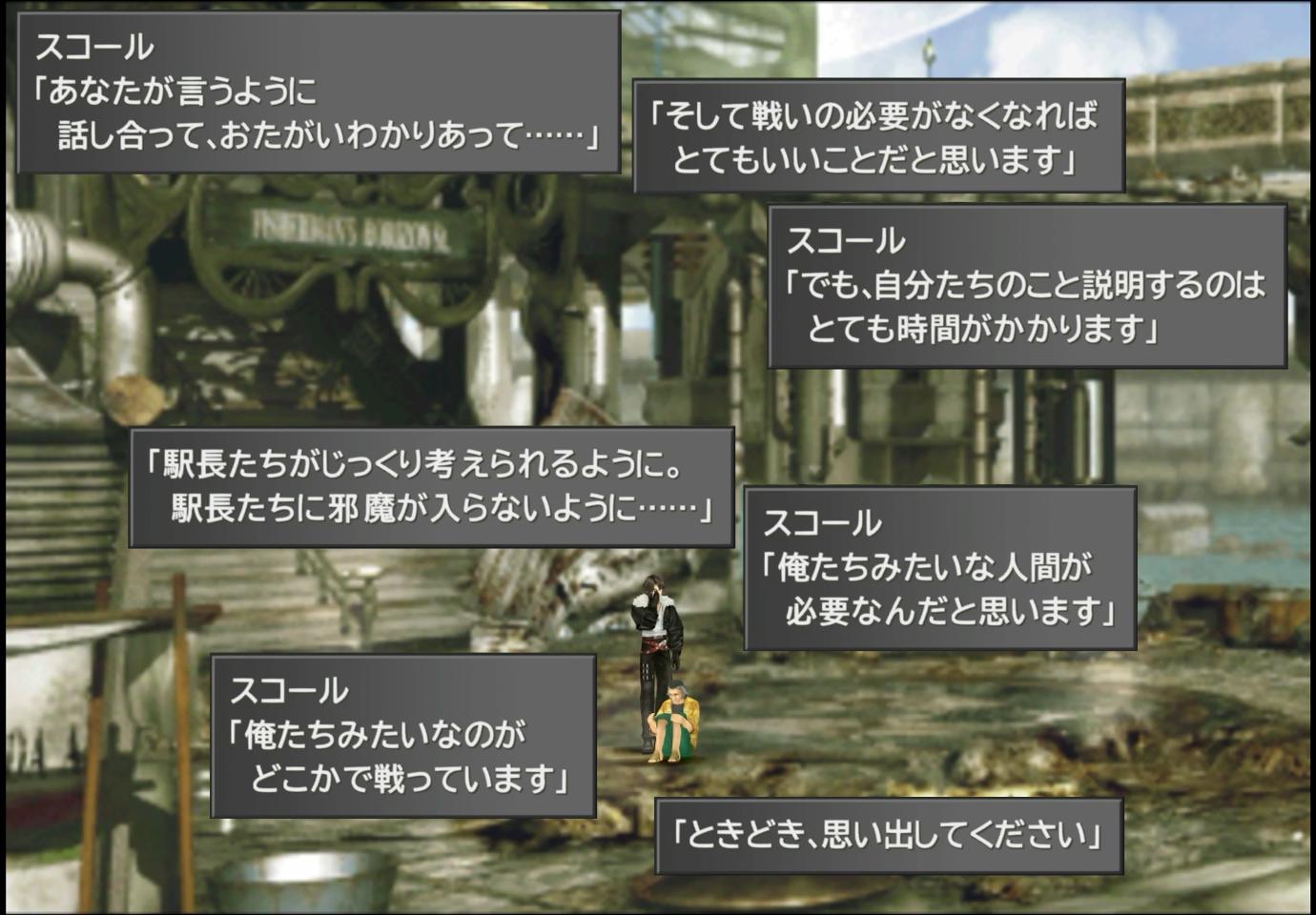 ――なお、内容としては、軍人のスコールが、武力による解決を拒否するドープを、肯定も否定もせず、「時間を作るために、自分たちが居る」という立場を説明する、というものである。ここは、スコールが大人の立ち位置を見せており、さすがFF主人公という感じだ。こんなことを言われてしまえば、全く反論ができないではないか。地味ながら、FF8の物語に対する理解度を上げてくれる会話イベントと言えるだろう。上記の動画にも、おまけとして収録してあるので、ご興味のある方はご覧いただきたい(【6:47〜】)。