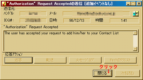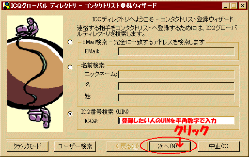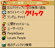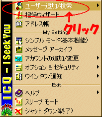 ICQボタンをクリックし、ユーザー追加/検索⇒ユーザー検索−リストへ追加をクリックします。