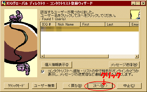 ICQ番号検索(UNI)へ登録したい人の番号を半角で入力し『次へ』をクリックします。