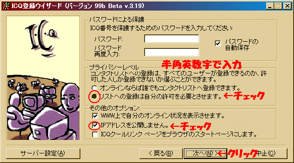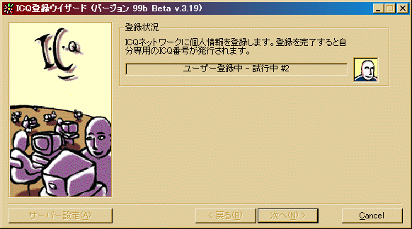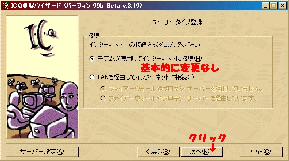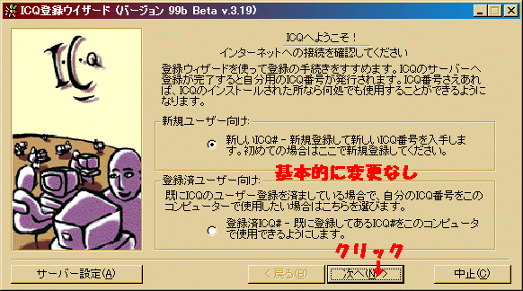 スタートメニューでICQを起動すると『ICQ登録ウイザード』が起動されます。
