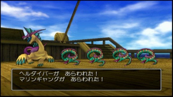 ・・・しかし、その島は文字通りマップの四隅に存在するため、船で向かうにはかなりの距離となる。そして遠いだけならまだしも、この時点としては異常なまでに敵が強いのだ。まず、ラプ○ス的デザインの「ヘルダイバー」はHPが高い上に「ヒャダルコ」や火炎によって大ダメージを与えてくる。また、「マリンギャング」は単体攻撃のみであるがとにかく数が多い。ということで、現段階の戦力ではとてもじゃないが島まで辿り着くことはできないため、もうひたすら逃避行を進めるだけである。逃げるんだよォーッッ!!