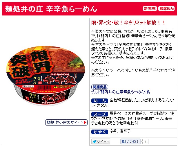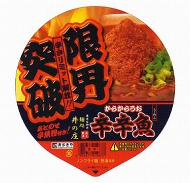 ――さて、このカップ麺は「激辛」がテーマであり、いわゆる「激辛(笑)」とは違って本当に辛く、生半可な気持ちで取り組むと確実に後悔する(※重要)ため、辛さが苦手な人は購入自体を控えるか、または辛味調味料の量を半分程度にするなどして、それぞれの形で楽しんでほしい。これは本当である。その他、この商品は何故か毎年1月末からの限定販売となっており、店にもよるが、概ね1ヶ月程度しか購入することができない。確かに、「好き嫌い」や「辛味に対する得意不得意」はあるだろうが、これだけの存在感を誇っているカップ麺なのだから、そろそろレギュラーメニューにしても良いと思うのだが・・・。