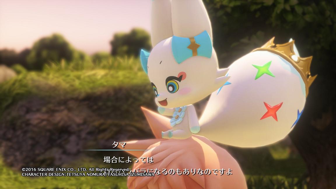 …というのも、まずは本作は2頭身のチビキャラ(プリメロ)と、5頭身程度のキャラクター(大人[オオビト])の2パターンの人物によって彩られており、シナリオ展開的にも、歴代FFシリーズのキャラクターが登場するという以上に昔のFFシリーズっぽい雰囲気を重視して作り上げられている。また、バトルシステム的にも、ATBを含みつつのターン性が取り入れられており、非常に分かりやすいものである。総合して、これが昔のFF作品が好きな人のために作られたタイトルということは、疑いようも無い事実なのである。とりわけ、「最近のFFはちょっとシステムが複雑でね…」などと思って敬遠されている方にはお勧めであると言えよう。その他、音楽に関しては13シリーズで大活躍した浜渦さんが担当した文句の付けようが無い出来であり、各種声優さんたちの演技もアニメっぽい雰囲気を醸し出すのに一役買っている。近年の主流ゲームとは一味違う、昔のゲームっぽい雰囲気を味わってみたいのならば、本作に触れてみる価値は大有りなのである。