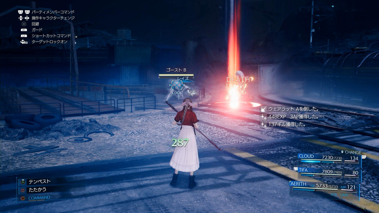 そんなわけで、まずエアリスと合流した後に、例のアレを見届ける。その後、イベントを挟むと、エアリスとティファで少しだけ戦闘があるものの、敵は雑魚のみなので問題は無い。これにて9章クリアーである。