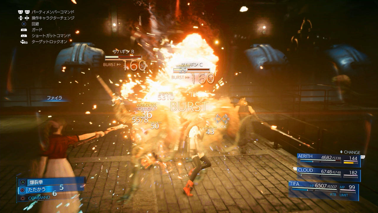 ――そのため、やむを得ずMPを使っていくことにし、「●せんせいこうげき」からの「サンダラ」や「ファイラ」を放って、開幕で敵の数を減らしていくことにした。クラウドはエアリスと比べて魔力が低いうえ、雷と炎の両方を使わないといけないバトルも多く、「●MPきゅうしゅう」を使ってもMPが削られていく。ただし、神羅ボックスも非常に多いため、それを使って回復していけば、MPを満タン近くに保ちながら上へと登っていける。