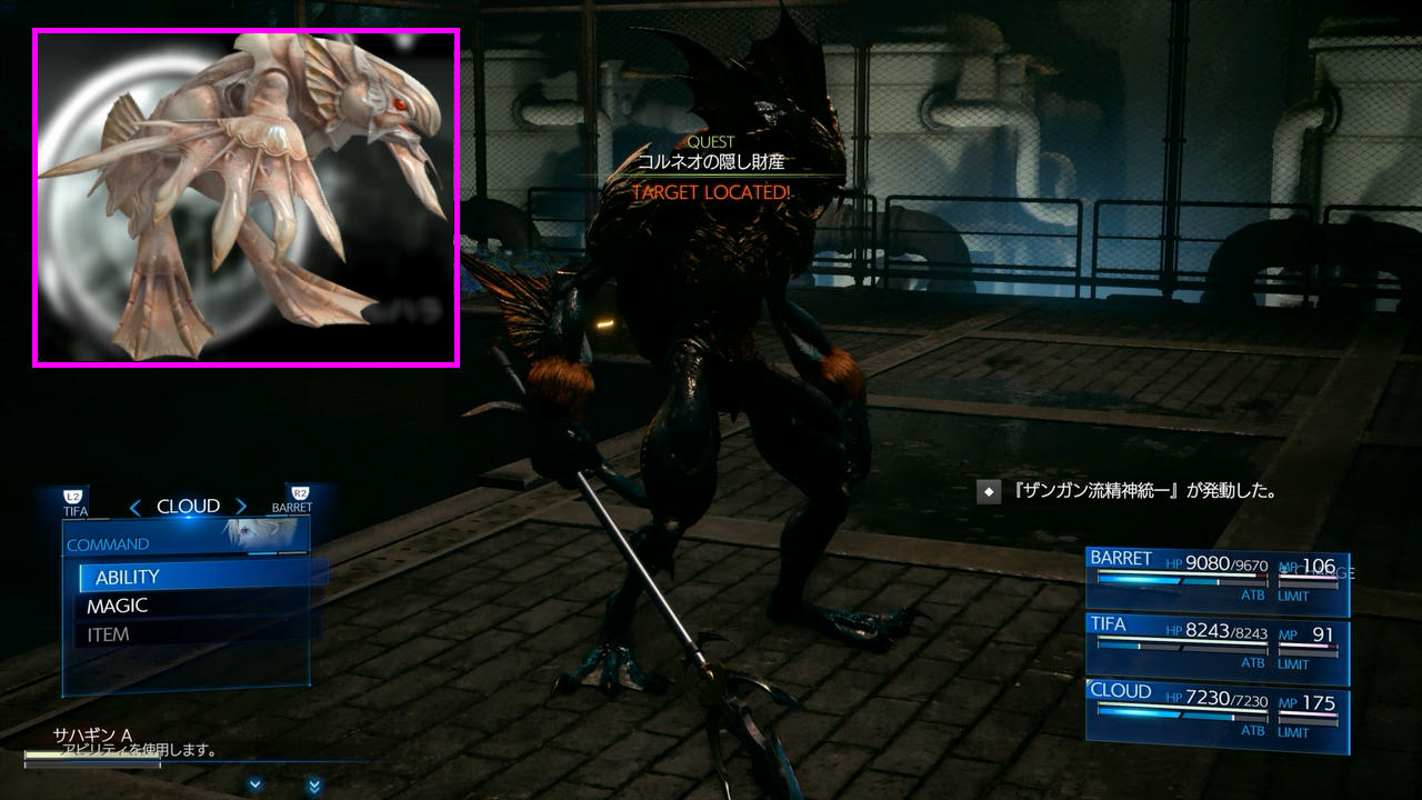 「エリゴル」…敵は、睡眠と沈黙の追加効果を持つ攻撃を使ってくる。睡眠は「ハチマキ」で無効化できるが、沈黙には対応するアクセサリが無い(そもそも本作には毒と睡眠にしか完全無効アクセサリが無い!)ため、沈黙による被害を軽減しようと思った場合、「●たいせい」を使用しなければならない。なるほど、「●たいせい」が重要とされるわけだね。そんなわけで、たいせいマテリアを全く育てていなかった私は沈黙を防げないので、初手でクラウドが「●せんせいこうげき」からのとりあえずバイオを決め、あとはエアリスが沈黙状態でも使用できる「いのり」でHPを回復しつつ戦っていく。MPを消費しない技と侮るなかれ、エアリスであれば全員3000回復と、切り札であるクラウドの範囲化ケアルガの6割もの回復量に達してくれるのだ。