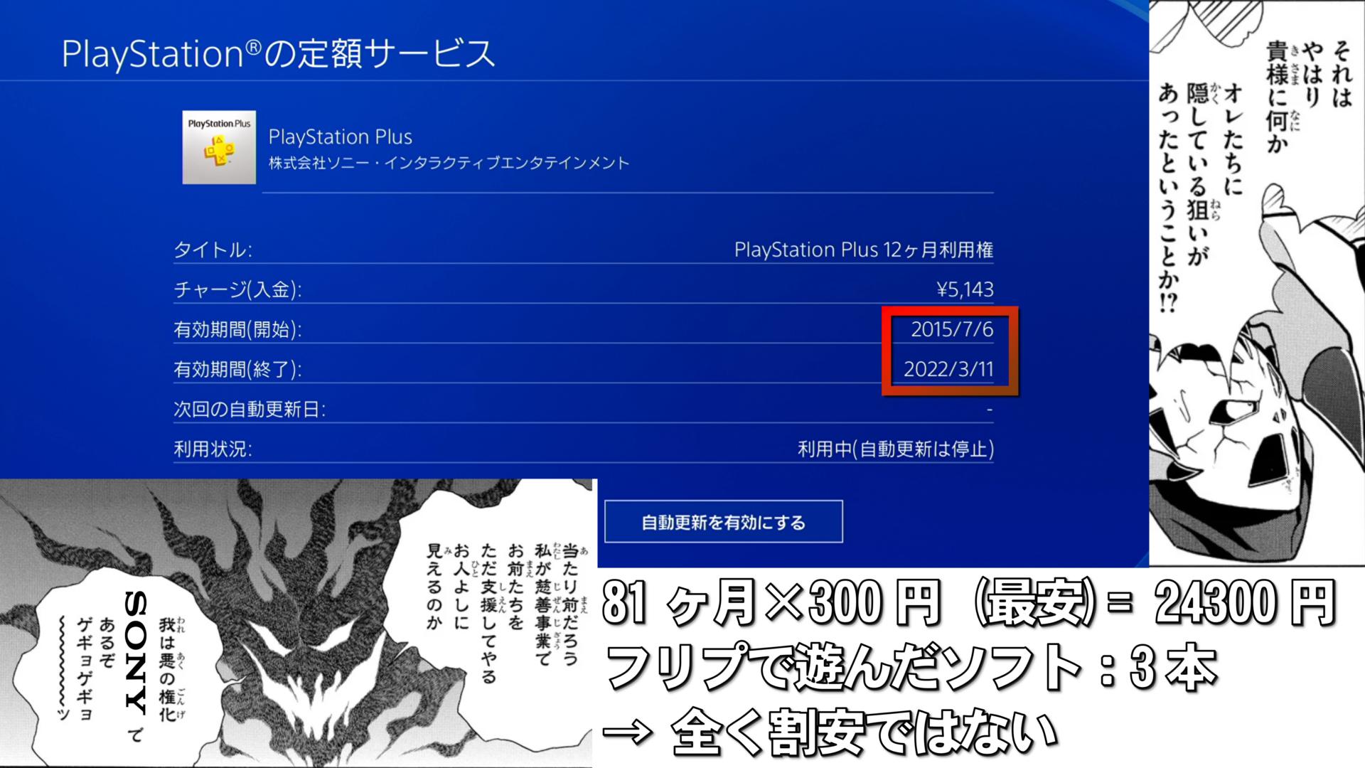 例えば、私の場合、アカウント情報から調べたところ、どうも2015年7月からPSplusに継続加入をしており、期限は来年3月までとなっているようだ。それについての料金を計算してみることにしよう。継続期間は、ちょっと計算を合せられなかったのだが、まあ2441日で81ヶ月ということにした。また、基本的には、割高な1ヶ月自動延長ではなく、「1年利用権を」「セール時に」購入しているため、最安値である30%OFF、つまり月額換算で300円とする。それらを合計し、この7年弱の加入料は、合計で24300円となる。