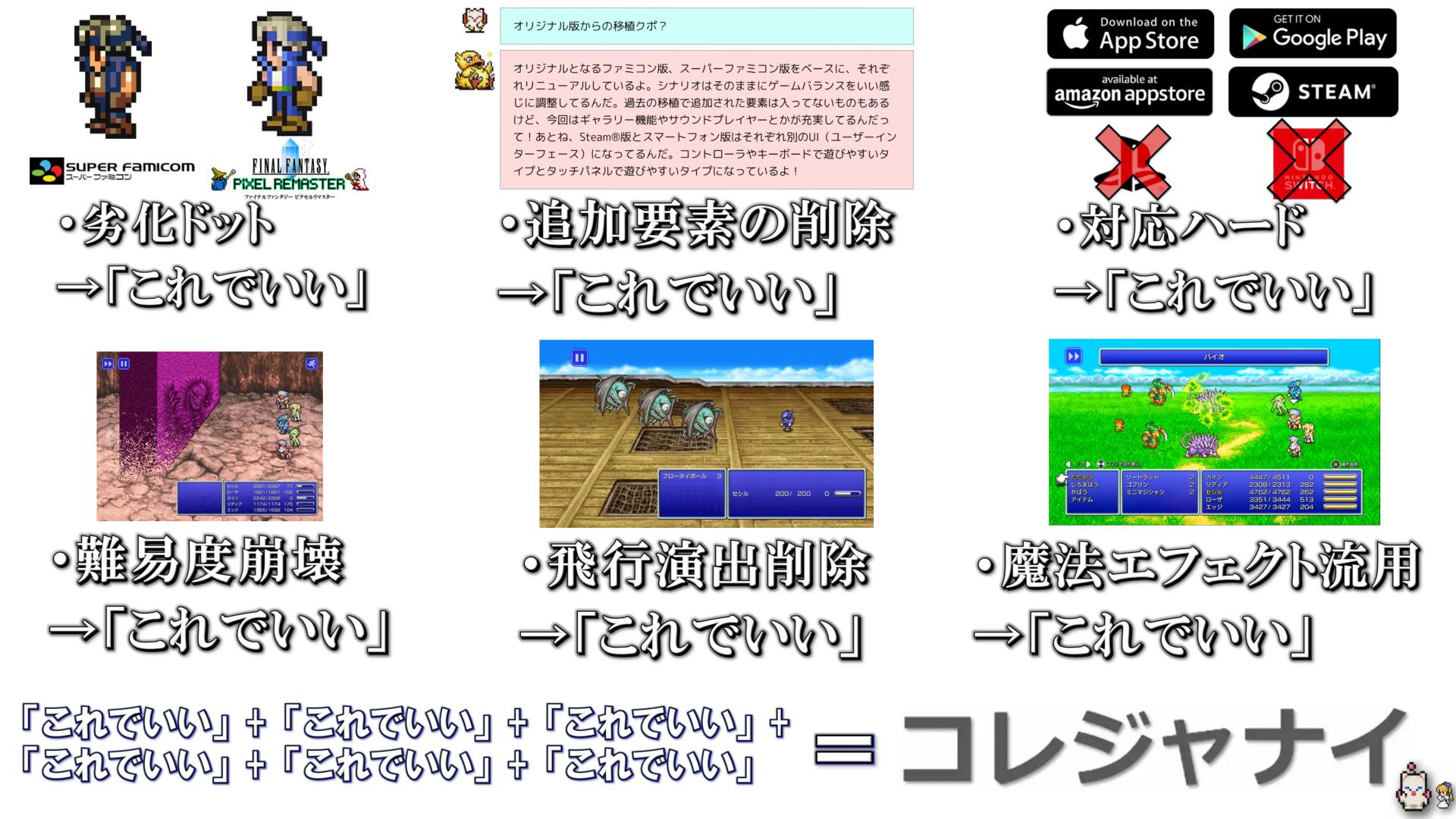 …しかし。最初に画像で紹介した、ウォルス城の水辺の表現など、「それくらいはどうでもいい」と思う人も居るだろう。ごもっともである。加えて、例えば”ピ4”の「飛行モンスターがふわふわしている演出の削除」「魔法エフェクトの『ゲーム性の統一』という名の使いまわし」「長すぎるスタッフロール」「ラスボスの形態変化時に9999の回復表示が出る」なども、単体では大したことのない要素である。しかし、そうやって、無数の妥協を積み重ねていった結果、どうしようもないクソ移植が完成してしまったのだ。人生の格言か何かだろうか。「これでいい」を足していくと、「コレジャナイ」になるのである。