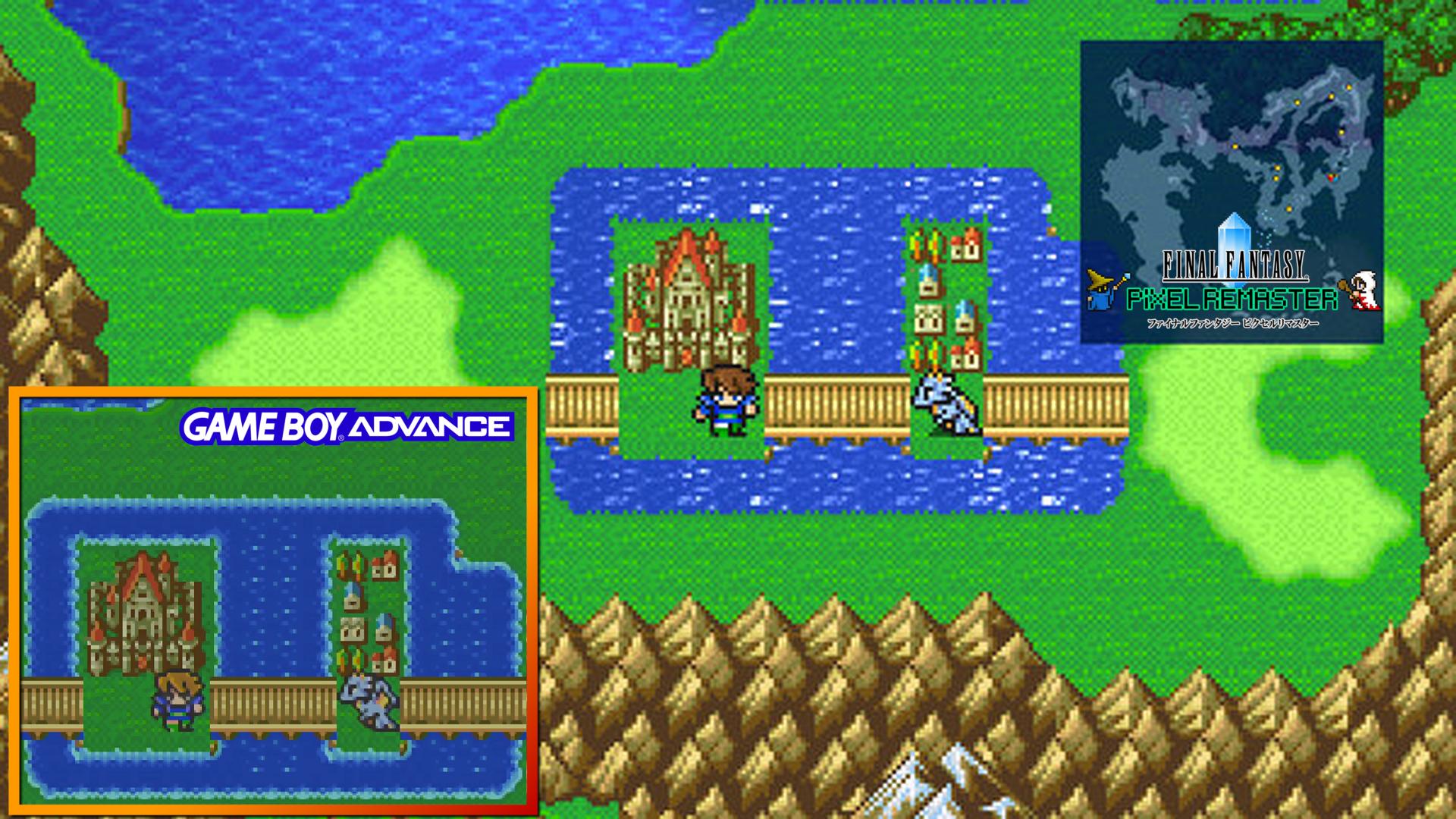ちなみに、左下は、私が所有している「WiiUバーチャルコンソールのGBA版」をこのためだけにプレイし、同一の場面で撮影をした画像である。GBA版では、地面と水の境界部分に”白波”のような描写がなされており、アニメーションこそしないものの、立体的に見えるよう表現がされている。もちろん、ベースとなったSFC版や、その移植であるPS版も同じである。旧スマホアプリ版についても、「劣化ドット」とか「顔の様子が変なのだ…」などと言われていたが、少なくともこんなどうでもいい部分まで突っ込まれることは無かった。