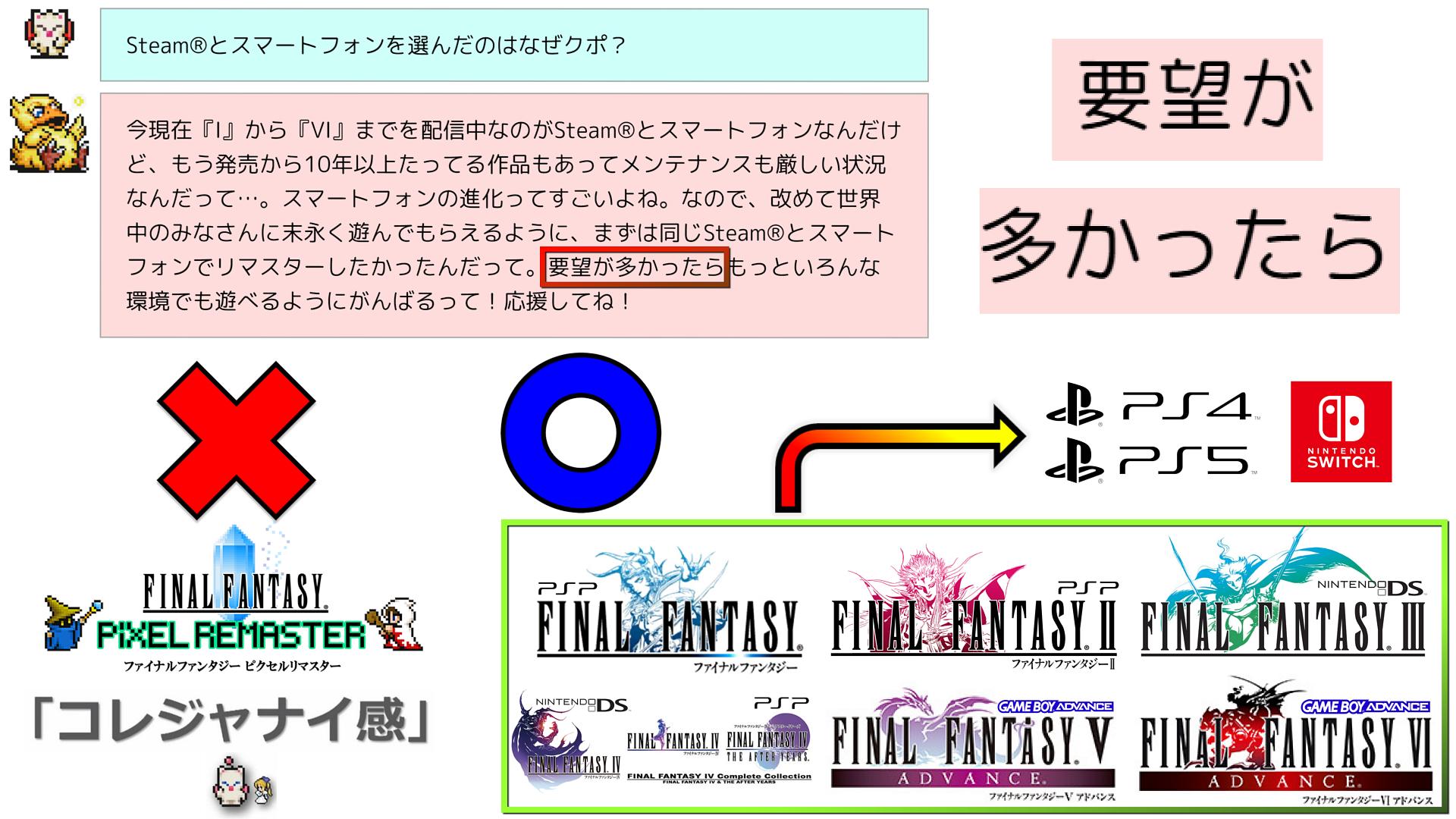 ――しかしながら。そういうバカゲー枠は、やはり「本筋がしっかりしていてこそ」というものである。そのため、前々から私が主張していることであるが、FF1・2はPSP版、FF3はDS版、FF4はPSP版と3DリメイクのDS版、FF5・6はGBA版を、それぞれ出力画素数だけを上げて、PS4/5やニンテンドースイッチといった現行機へと移植してほしい。お笑いリマスターの発売など、その後で十分だ。そしてその際はもちろん、明らかに“おまけ”と分かるような枠・価格にする必要がある。だって、新参者がピクセルリマスター(笑)を買って、「FFってこんなにつまらないのか」と思ったら困るだろ?