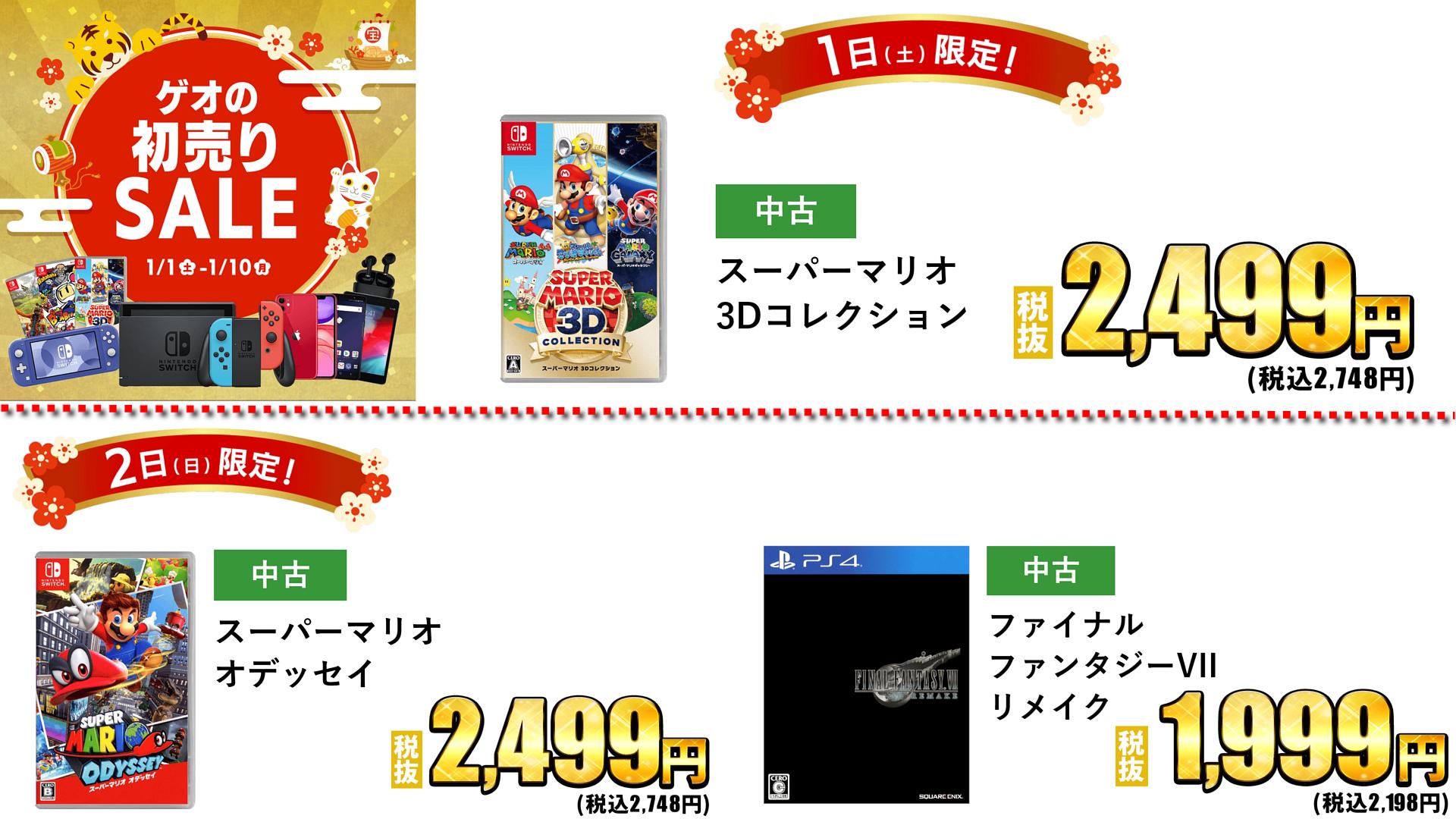3Dコレクション(マリオ64+サンシャイン+ギャラクシー)」と「マリオオデッセイ」の中古ソフトが値引き対象となっている。また、PS4の「FF7リメイク(第1弾)」も、かなり安く買えるようだ。最近では、PS5版やPC版での上位バージョンばかりが話題となるが、PS4版も単体のRPGとして十分なクオリティを誇るので、未プレイの方は、この機会にやってみると良いであろう。その他のセール作品については、【ゲオの紹介ページ】をご覧いただきたい。