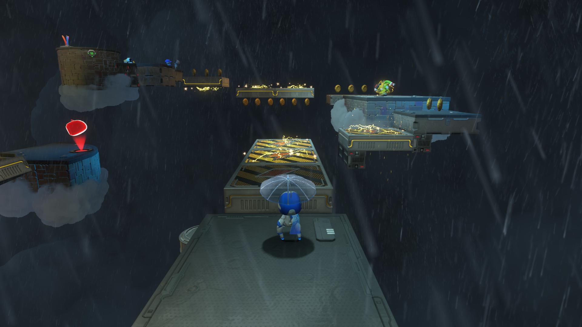 …まず、基本のジャンピングアクション部分は、初見でも説明なしで理解できるくらいの簡単操作であるが、キャラクターを動かしているだけで楽しく、3Dアクションの基本的な要素を満たしている。また、アストロが、潰されてペラペラになったり、電撃でしびれたり、凍りついたりといった死亡モーションの多彩さは、往年の「クラッシュ・バンディクー」を彷彿とさせる。2秒ほどですぐ近くから復活できるため、テンポの悪化も無い。そして、各ステージは、適度な頻度で仕掛けが挿入され、風景も頻繁に入れ替わるため、遊んでいて飽きさせない。一方で、収集要素をコンプリートしようとすると、なかなか歯ごたえのある難易度となってきて、そういう調整も絶妙である。普通に、これをパッケージゲームのボリュームで遊びたいのだが?