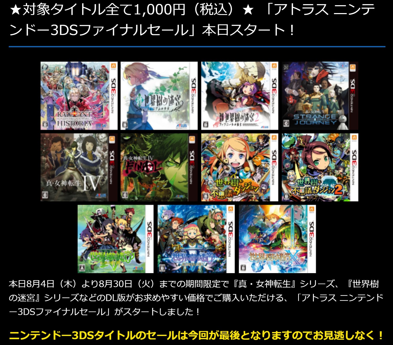 1ヶ月を切ったので、忘れずに告知をしておきたい。旧任天堂ハードである「WiiU&3DS」のDL版ストアは、この2022年8月30日の13時30分にて終了である(【任天堂公式の告知】)。